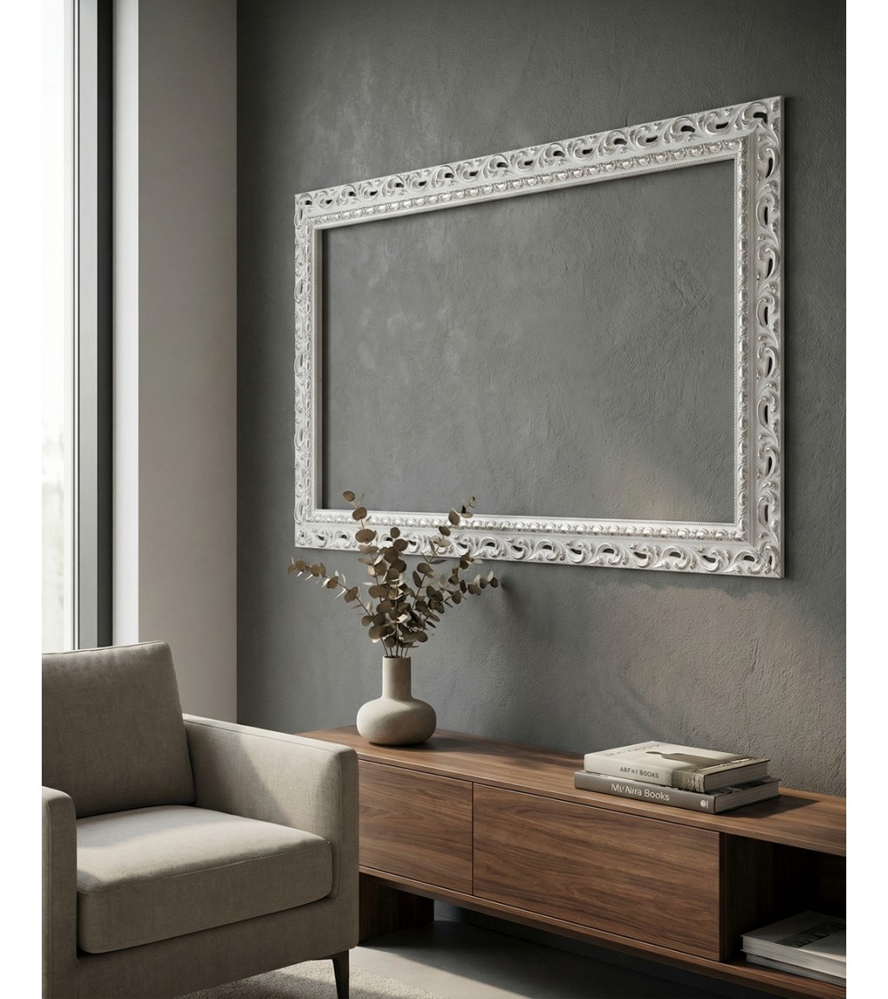 An elegant classic Baroque-style openwork frame , handcrafted from wood and finished in a refined combination of white and silver details . A frame of great aesthetic value, featuring finely crafted openwork carvings , which recall the Baroque decorative tradition and bring light, depth, and prestige to the room.