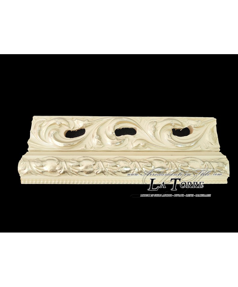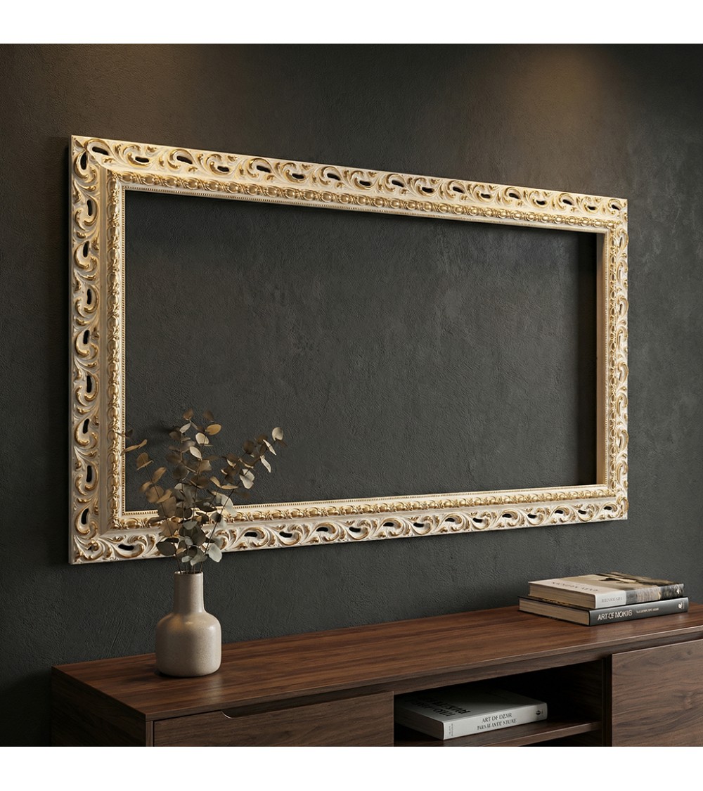 An elegant classic Baroque-style openwork frame , handcrafted from wood and finished in a refined combination of ivory and gold . A frame of great aesthetic value, featuring finely crafted openwork carvings that recall the Baroque decorative tradition and bring light, depth, and prestige to the room.