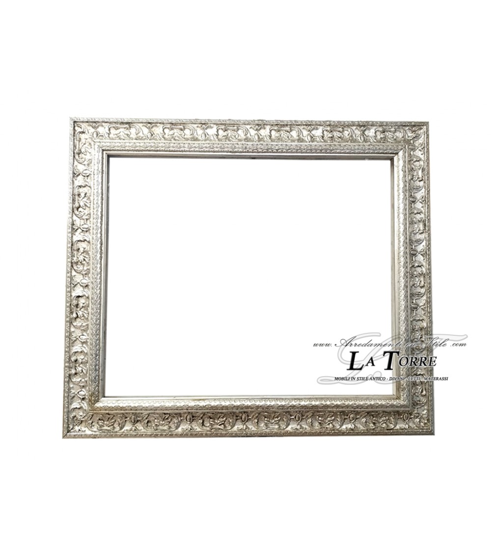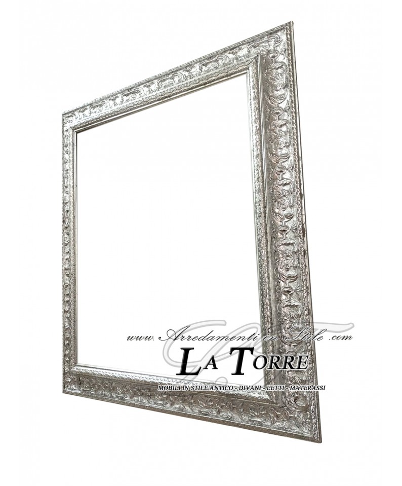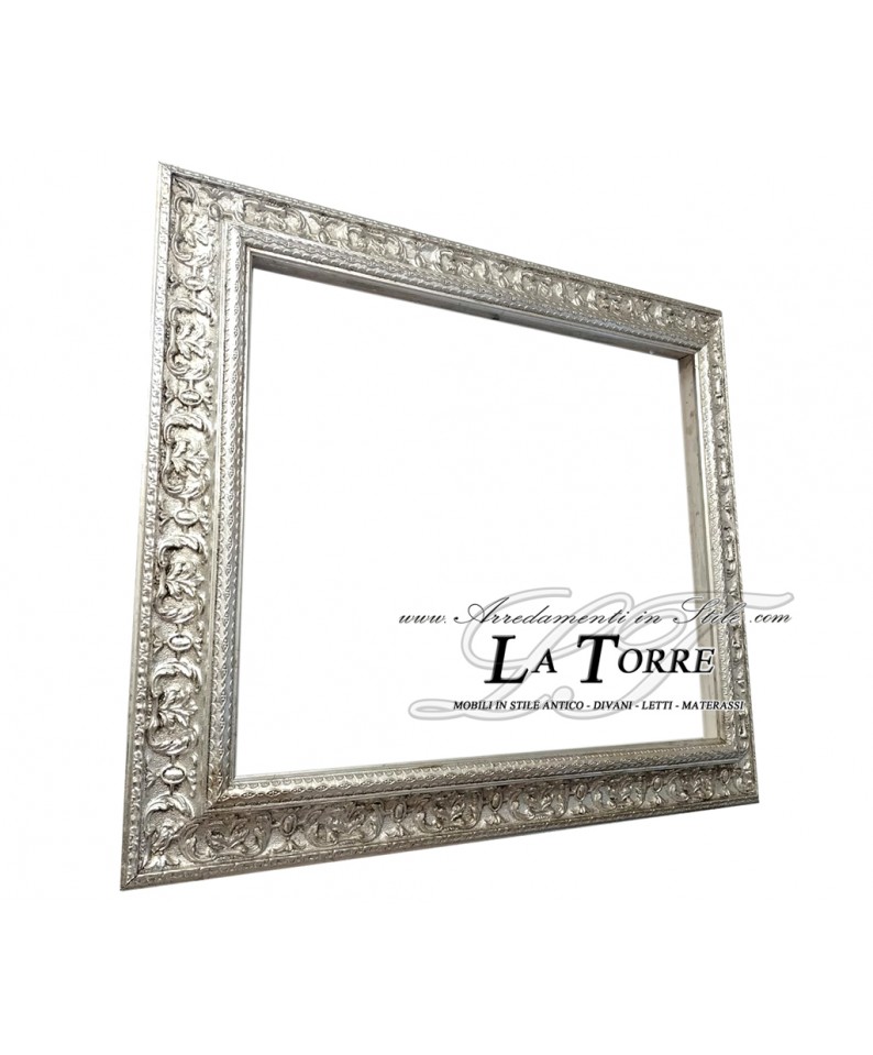 Frame that embodies the elegance and richness of the Baroque style. Crafted from wood with a sumptuous burnished silver leaf finish, the frame features elaborate carvings and decorative details that emphasize its grandeur.