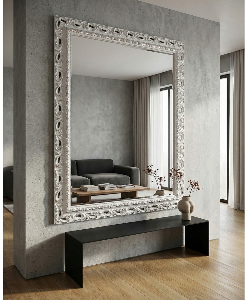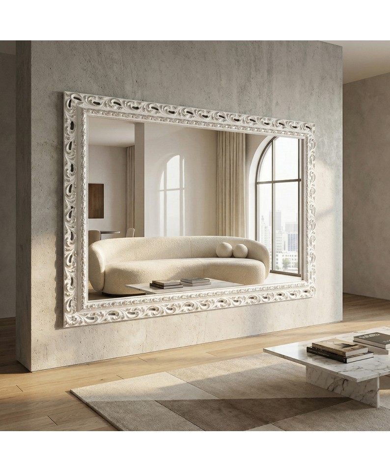 An elegant classic Baroque-style openwork mirror , handcrafted from wood and finished in a refined combination of white and silver . The frame, featuring finely crafted openwork carvings , expresses all the decorative richness of the Baroque style, lending brightness, depth, and timeless elegance to the room.