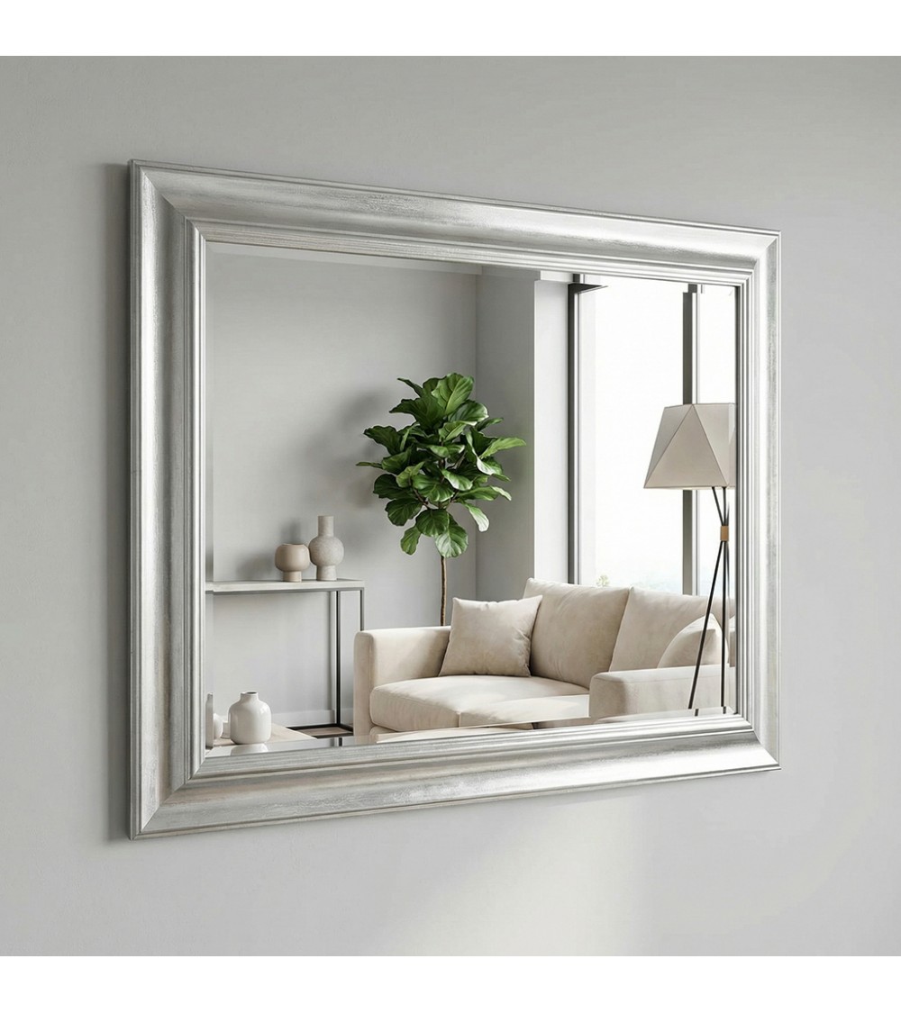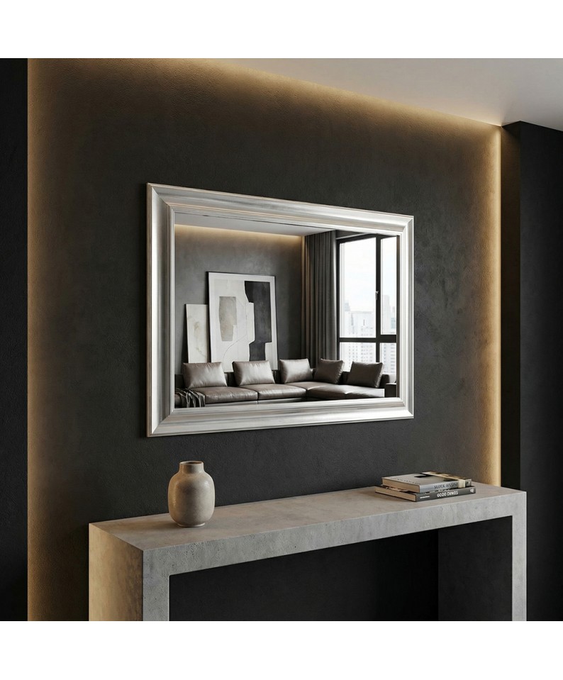 An elegant, custom-made modern mirror with a classic frame , featuring a refined silver finish that combines clean lines and contemporary style with a solid, decorative profile. The Rovescio model is designed for modern, minimalist, or transitional spaces, where the mirror becomes a functional and visually striking furnishing element.