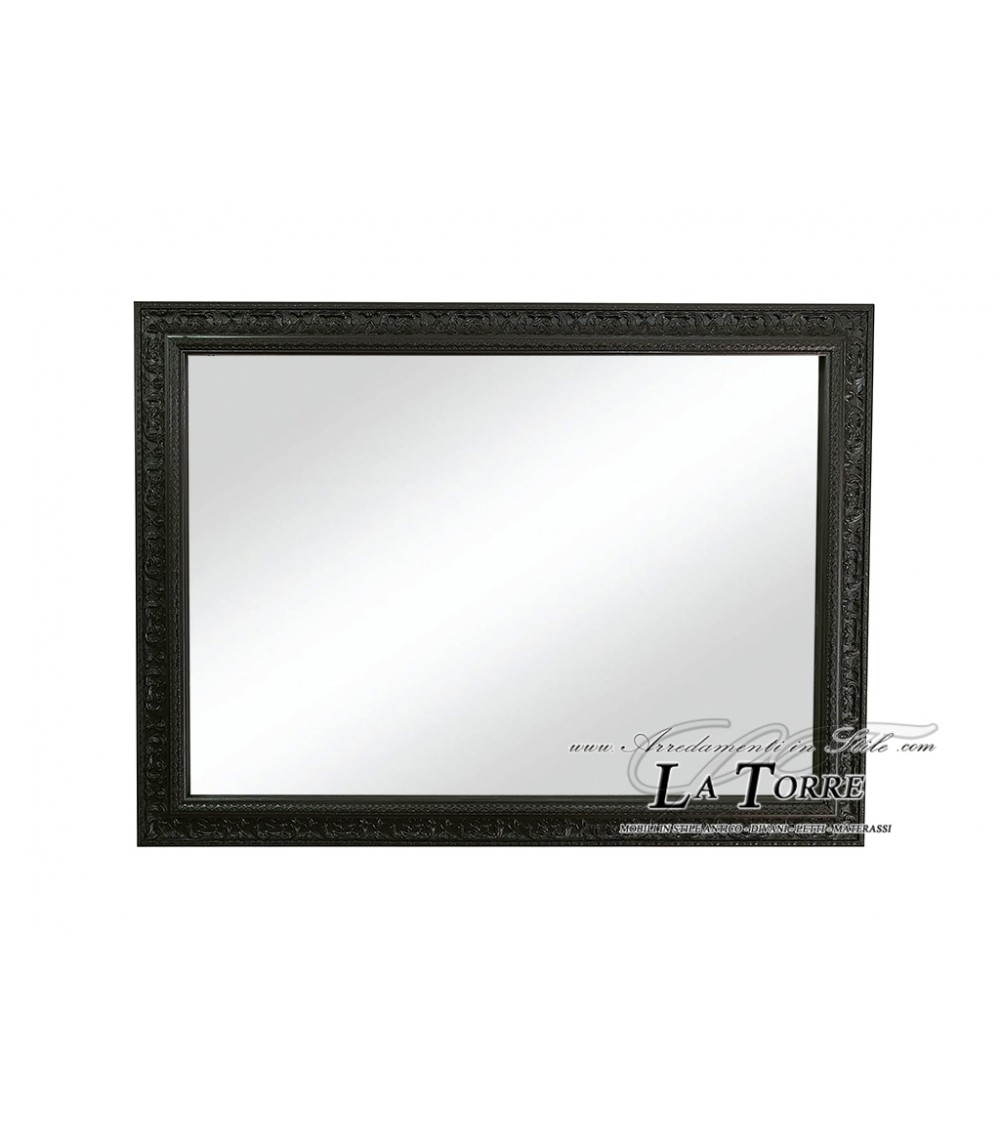 Wall mirror features a square baroque style frame with a black finish. The frame is made of wood and its design is characterized by elaborate carvings and stylized floral decorations, typical of the baroque style.