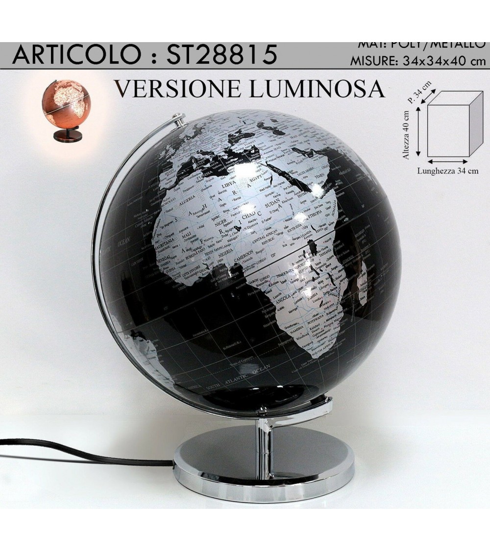 Extra classic black silver world map, globe with luminous sphere cartography ST28815