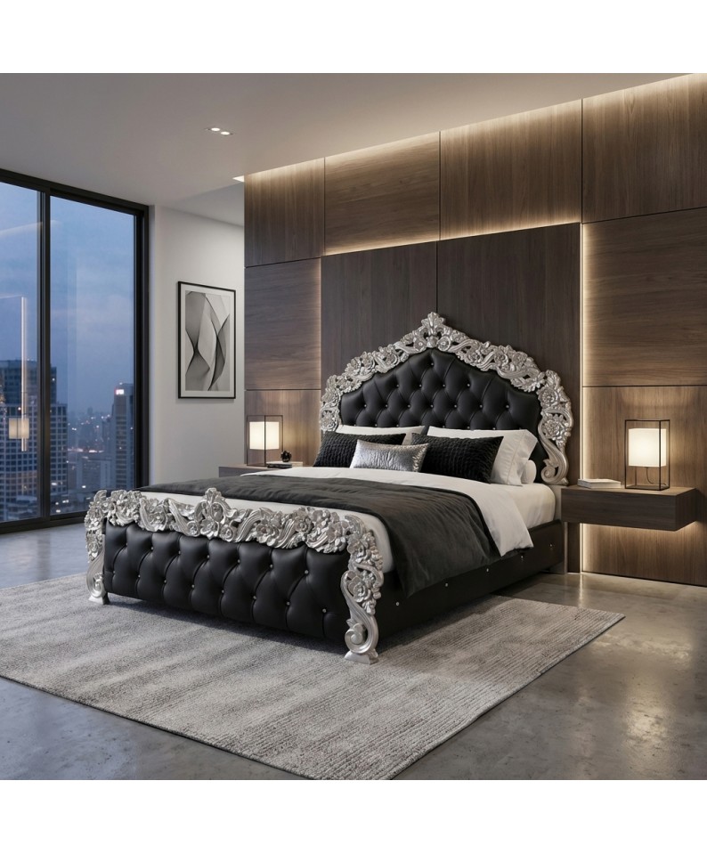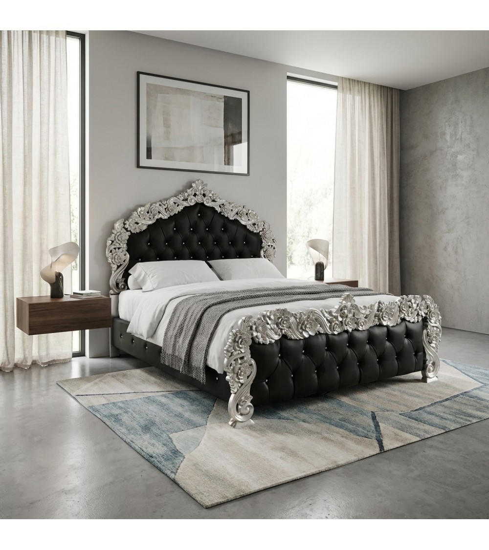 The PILISSENA baroque king-size double bed is a refined piece of furniture designed for elegant and prestigious bedrooms. The frame is crafted from carved wood with rich baroque-style decorations, enhanced by a fine silver leaf finish that adds brightness and character to the room.