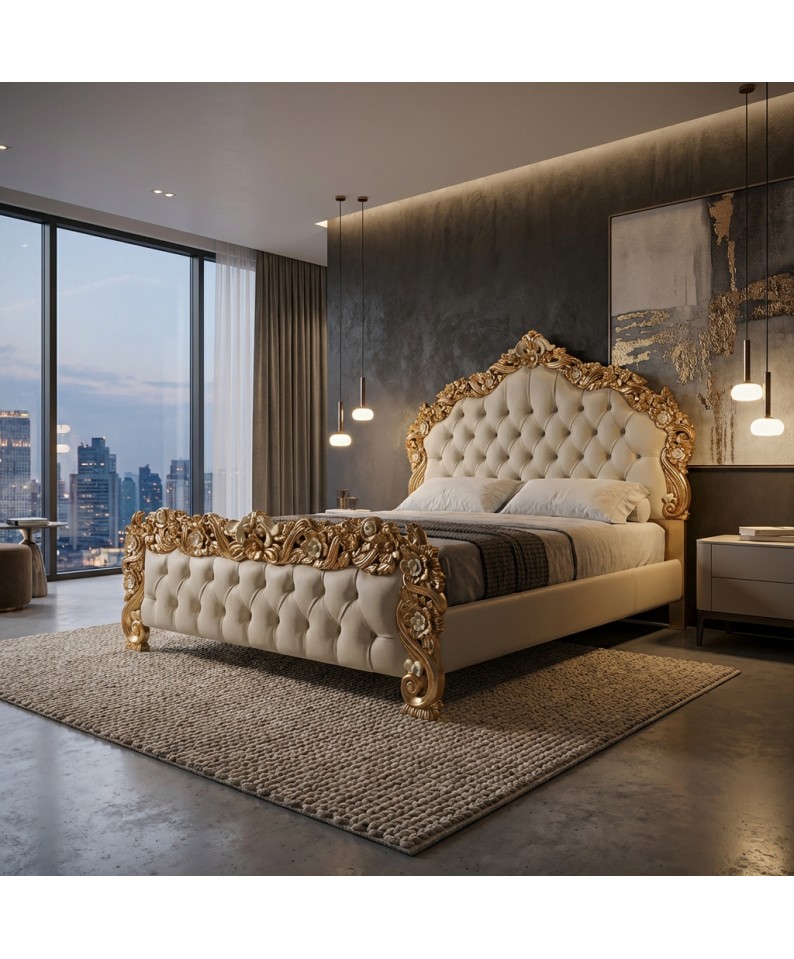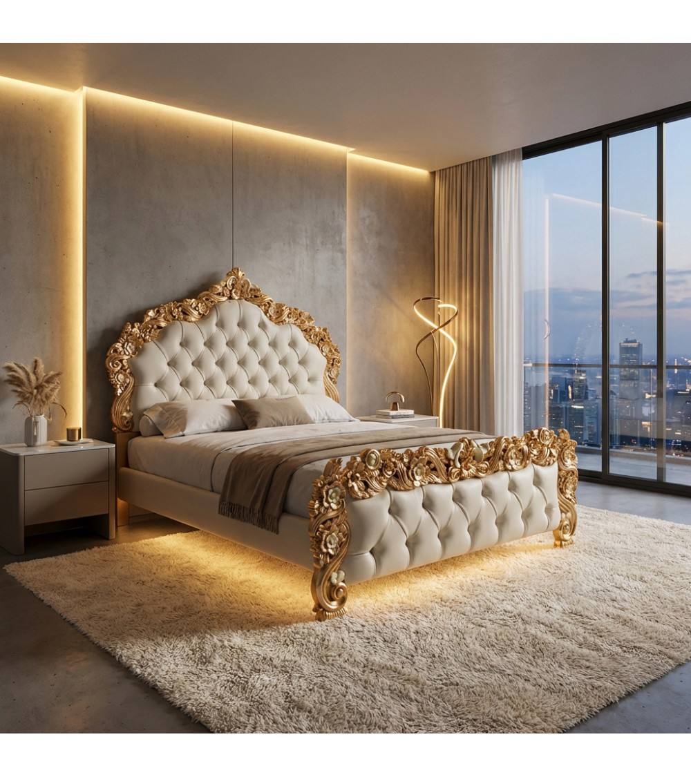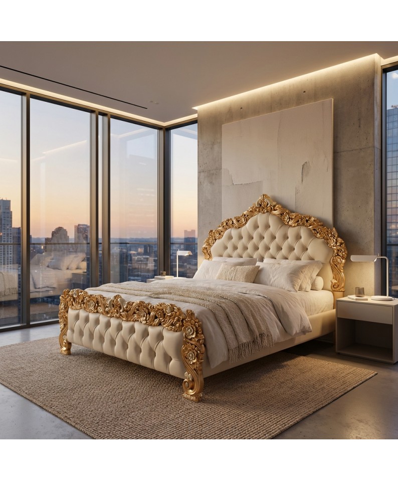 The version offered features a gold leaf frame and ivory eco-leather upholstery , a luminous and prestigious combination. The tufted detailing on the headboard and footboard lends softness, depth, and timeless elegance.