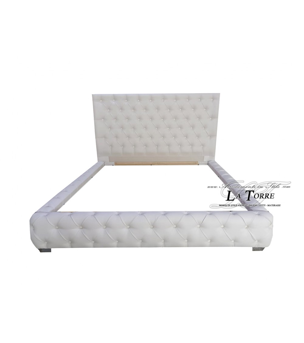 Classic style bed, composed of a headboard, footboard and side rails, ready to accommodate a bed base and a mattress. All the elements are covered in an elegant white eco-leather with capitonné workmanship, characterized by deeply recessed buttons that create a diamond pattern. This workmanship gives the bed a luxurious look and a touch of refinement.