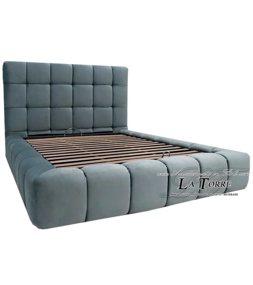 King size double bed that stands out for its modern and geometric design, characterized by a high and imposing headboard. The headboard, covered in a soft green velvet fabric, has a padded square design that creates a three-dimensional effect, adding a touch of modernity and texture.