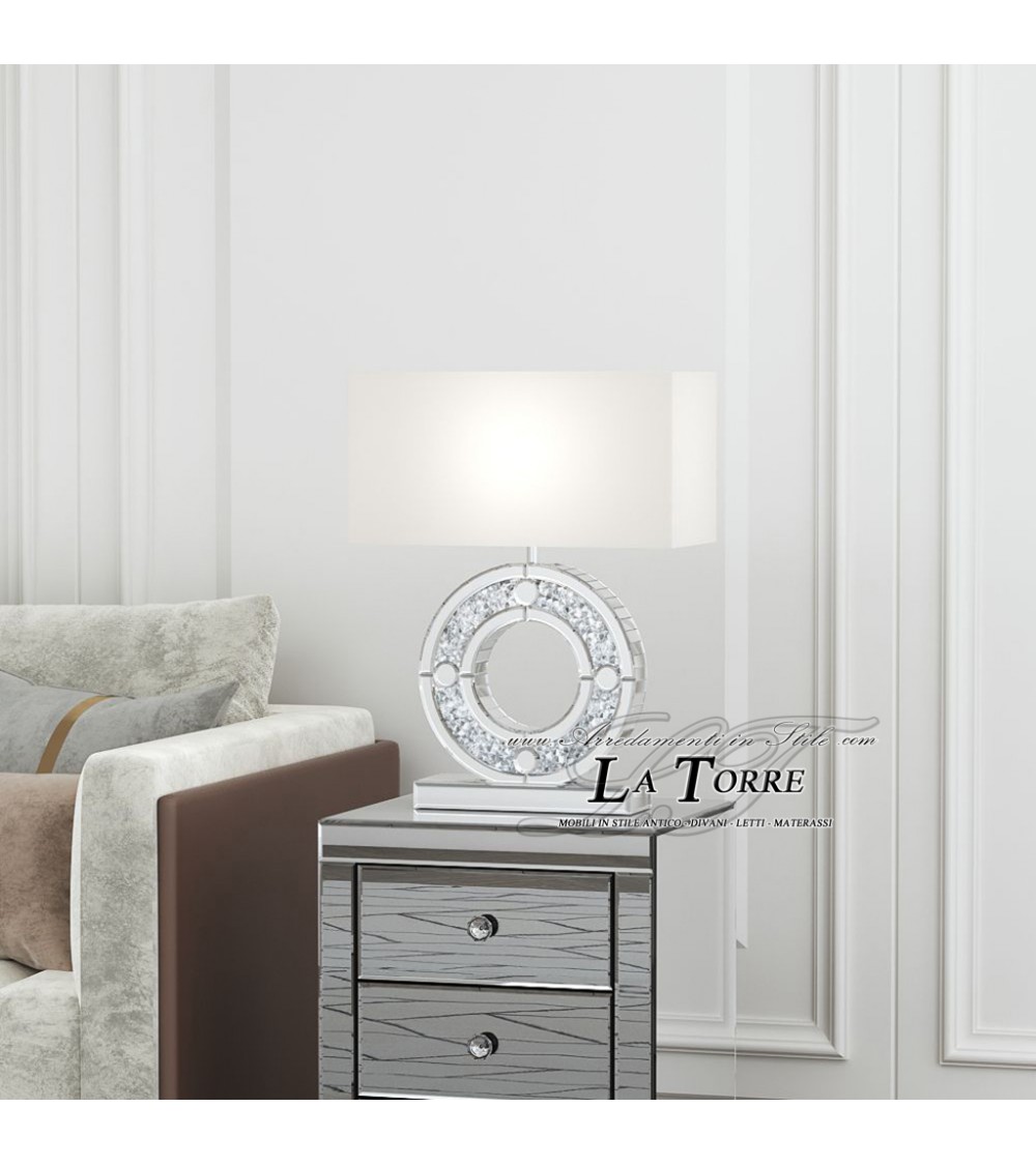 Add a touch of elegance and prestige to your interiors with this modern table lamp, featuring a circular mirrored base embellished with embedded Swarovski crystals.
