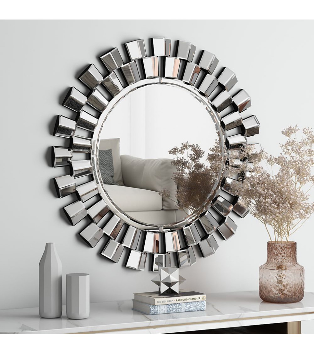 Round Silver Wall Mirror – Luxury Modern Ray Frame Ø90cm A55G