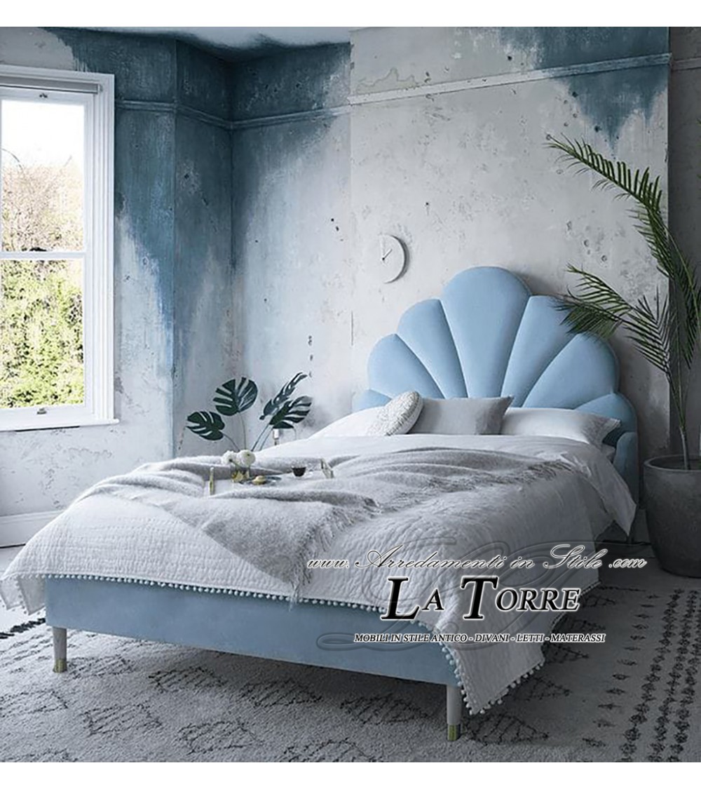 Double bed stands out for its romantic and sophisticated design, characterized by a shell-shaped headboard. The headboard, tall and imposing, is covered in a soft velvety fabric of a delicate powder blue, which adds a touch of elegance and serenity to the room. The shell shape, with its soft and sinuous lines, creates a welcoming and relaxing atmosphere, inviting rest and relaxation.