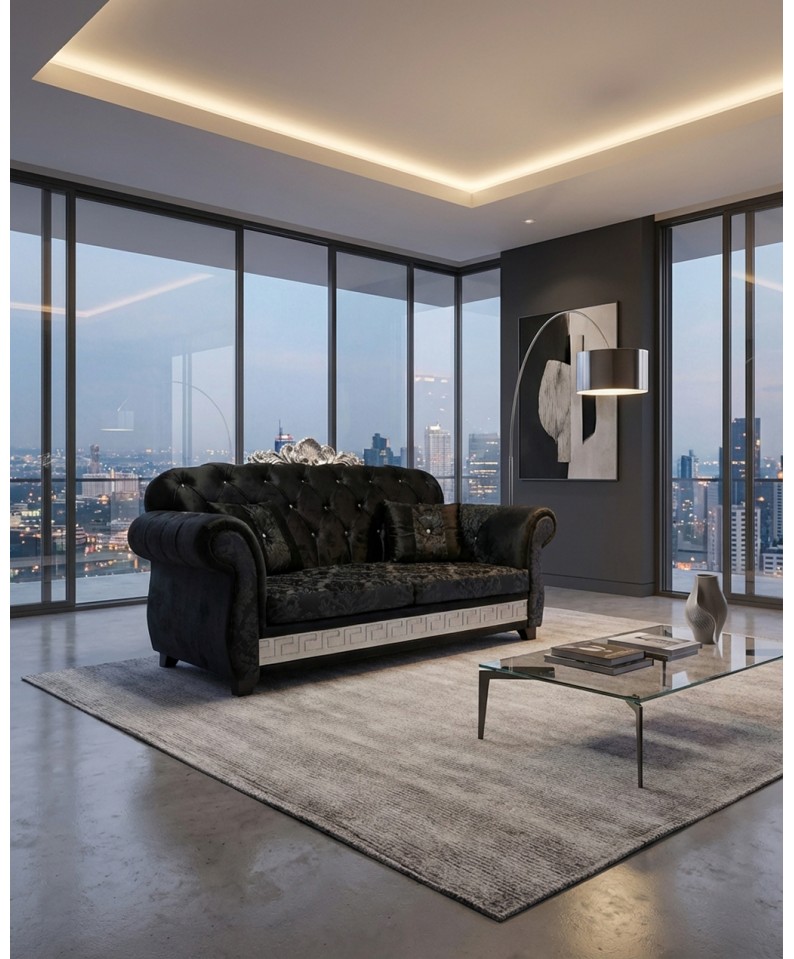The front base can be made either with capitonné workmanship or with an elegant Greek key motif , at no additional cost, thus offering the possibility of adapting the design to your taste.