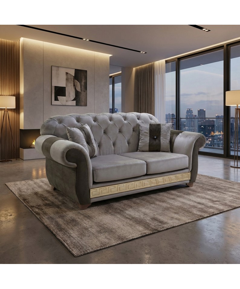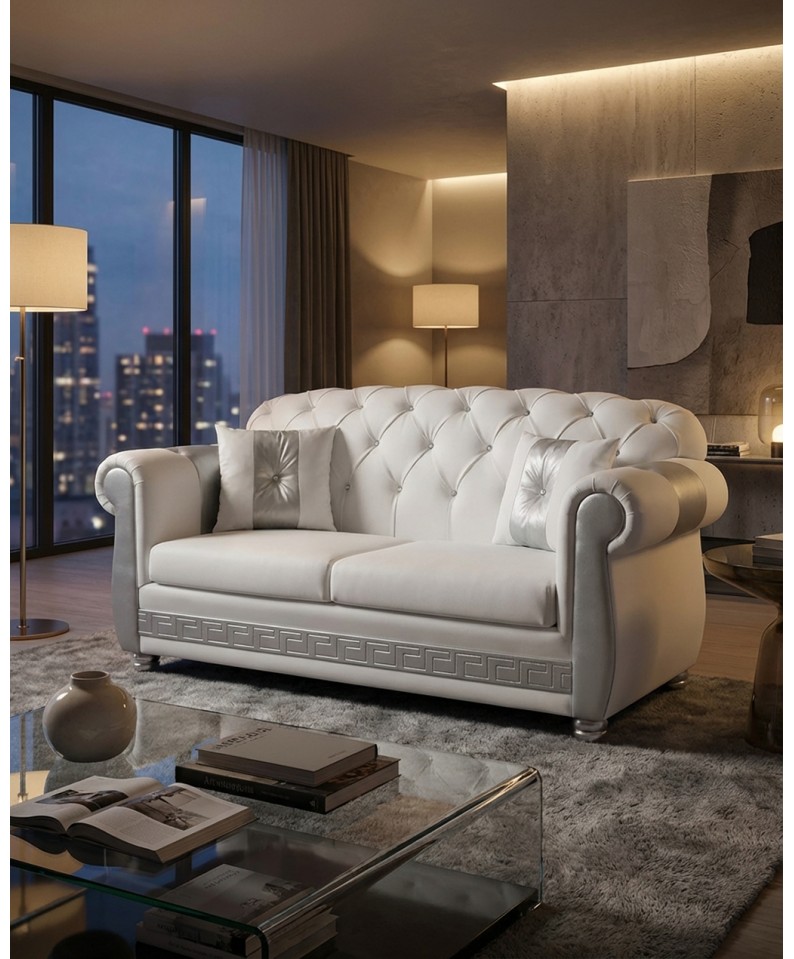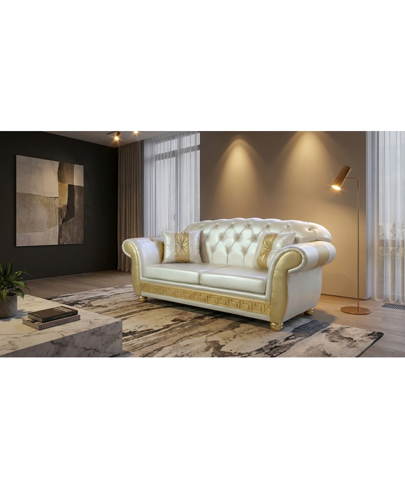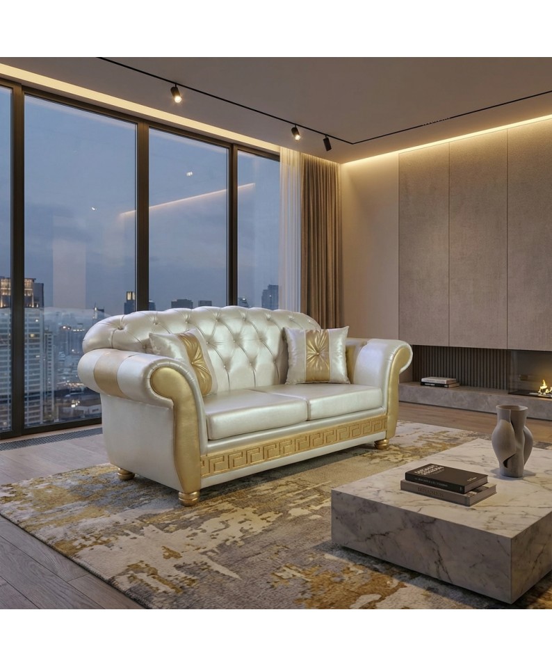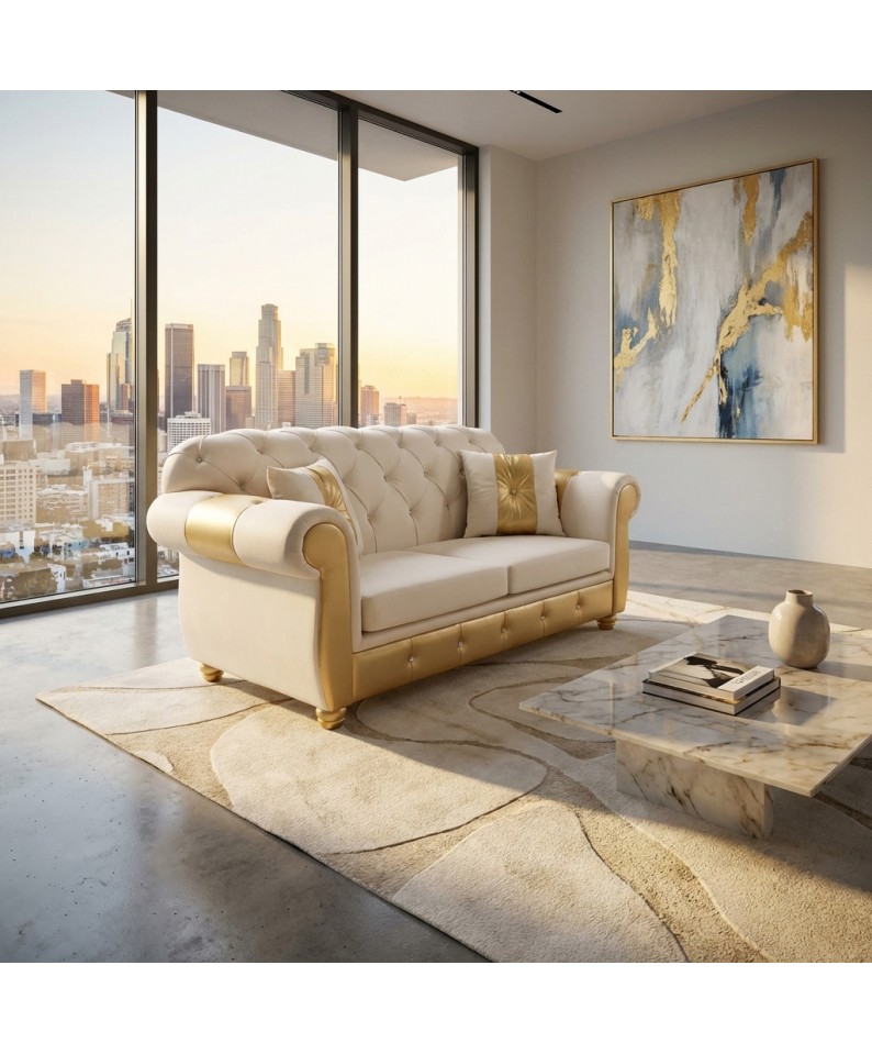 The AZ02 2-Seater Chesterfield Sofa Bed in a refined pearl white and gold finish represents the excellence of luxury furniture, where luminous materials and artisanal workmanship blend to create an elegant and sophisticated effect.