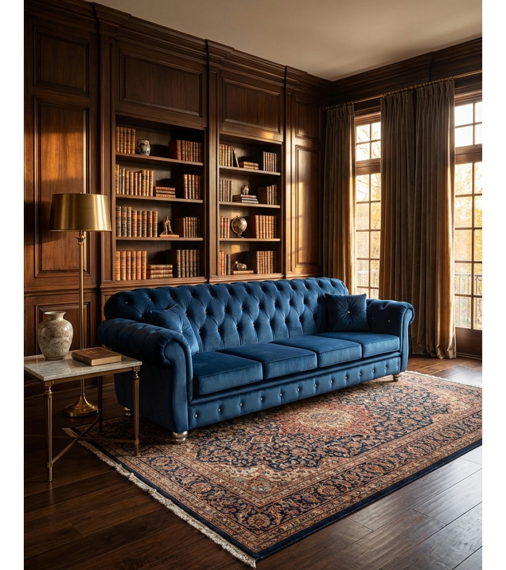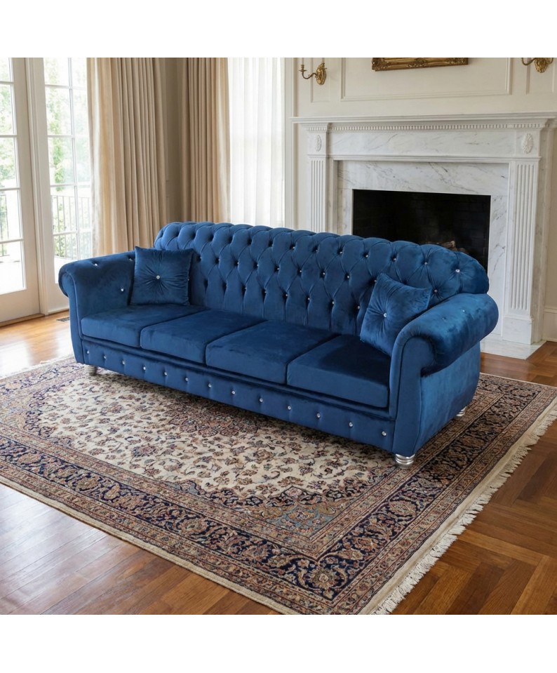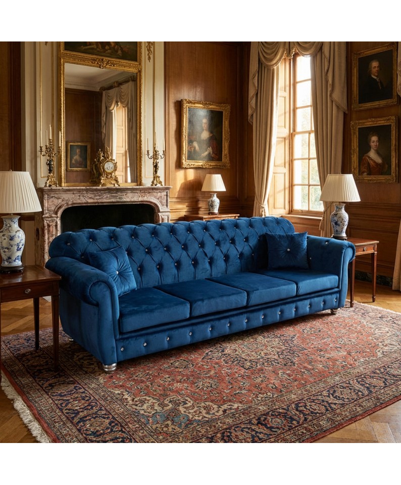 4-seater sofa bed base and mattress in baroque living room faux leather blue velveteen swarovski buttons AZ04