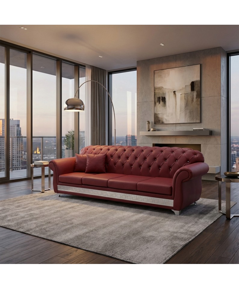 The rounded armrests recall the iconic design of Chesterfield sofas, while the front base is embellished with an elegant Greek key decorative frieze , an element that adds prestige and recalls the classic style of luxury furniture.