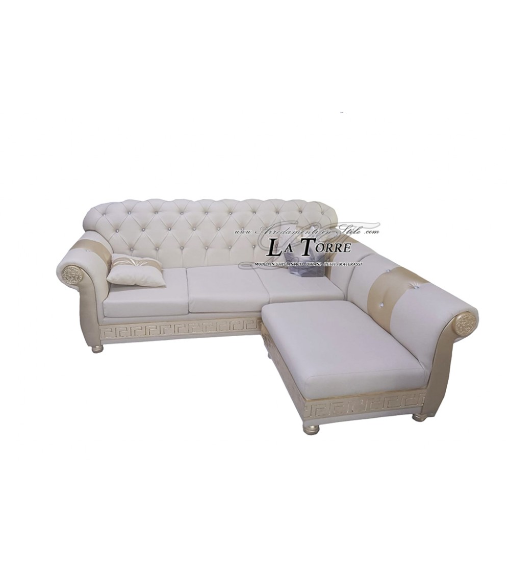 3 seater sofa with mattress base and peninsula Baroque Chesterfield faux leather champagne ivory swarovski AZ06