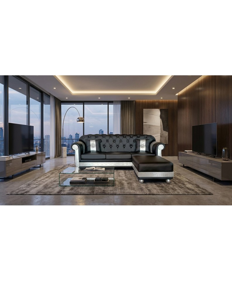 The contoured armrests and base finished with a silver Greek key motif further enhance the sofa's aesthetic, while the peninsula offers comfort and practicality, making it perfect for moments of relaxation.