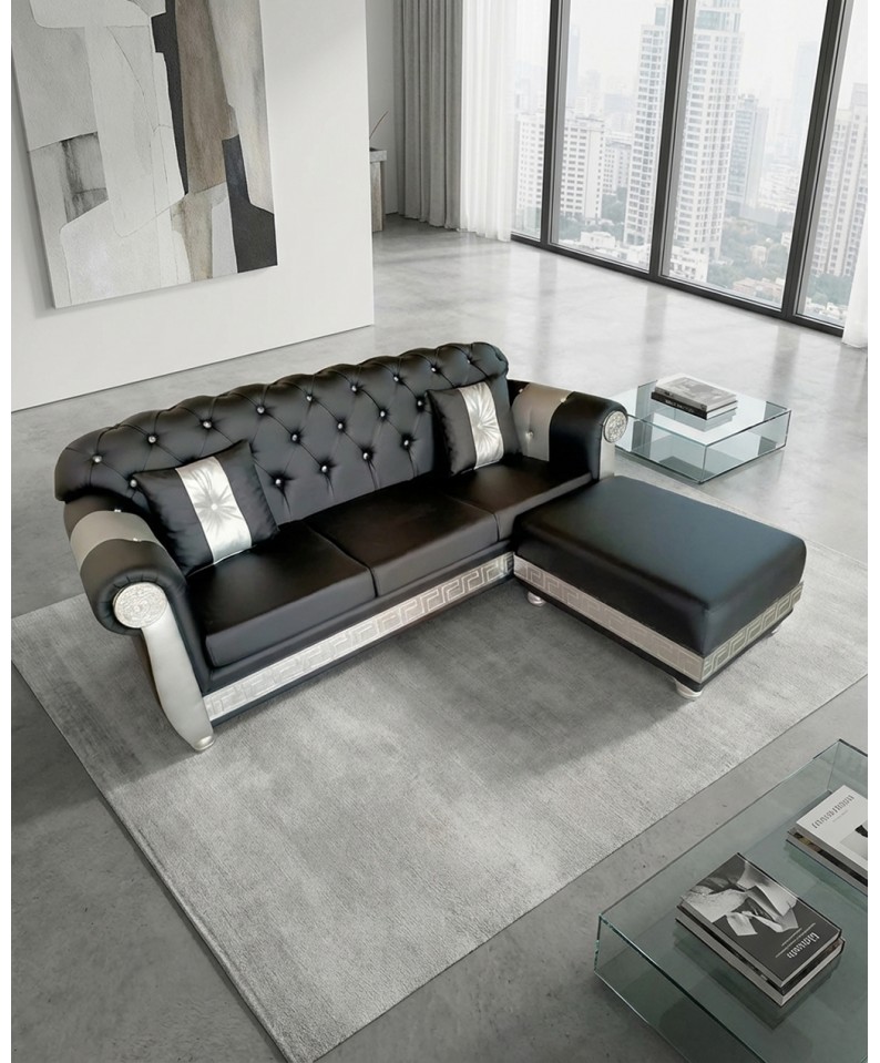 3 seater peninsula sofa with bed base and mattress, modern Chesterfield, Medusa Goddess, eco-leather, any color, Swarovski AZ05