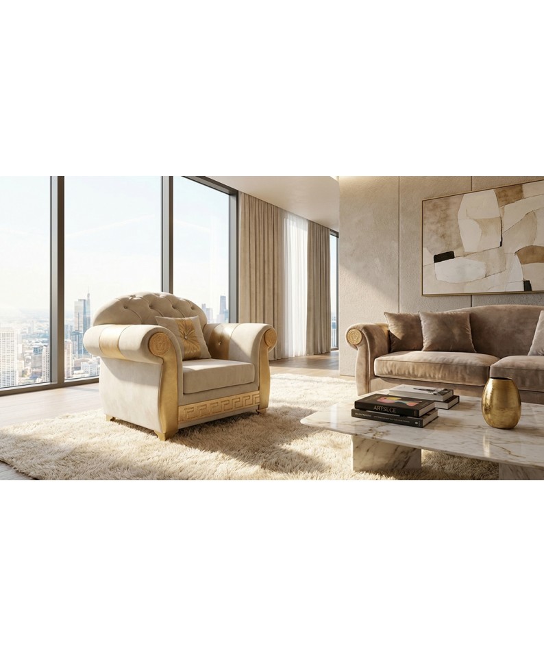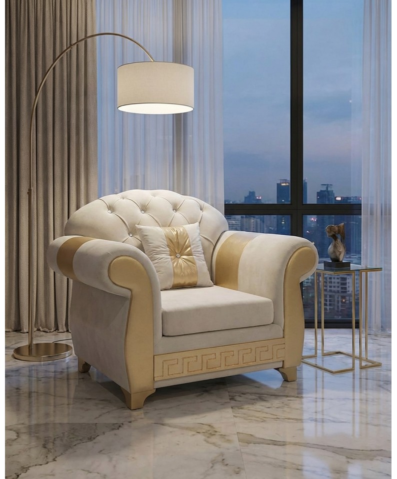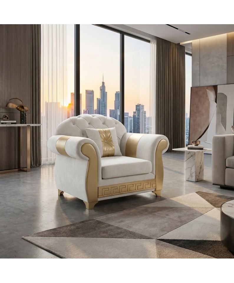 The Chesterfield armchair in ivory and gold finish represents a perfect balance between classic elegance and contemporary design, ideal for refined and bright environments.