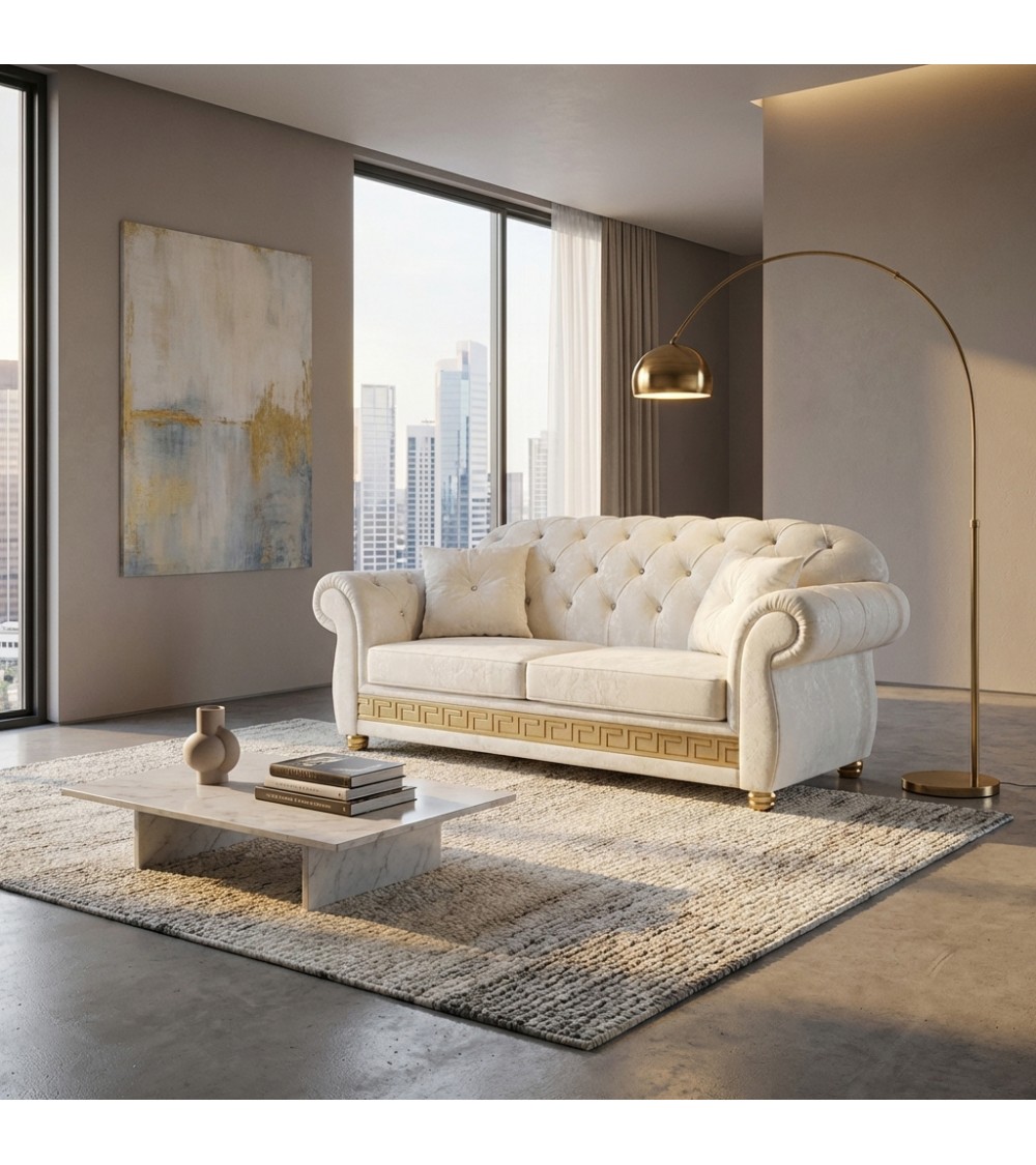 The soft, enveloping lines of the armrests, combined with a compact, harmonious structure, ensure comfort and perfect proportions even in the smallest spaces. The front base is embellished with an elegant Greek fret , a distinctive element that recalls a classic aesthetic and further enhances the sofa's design.