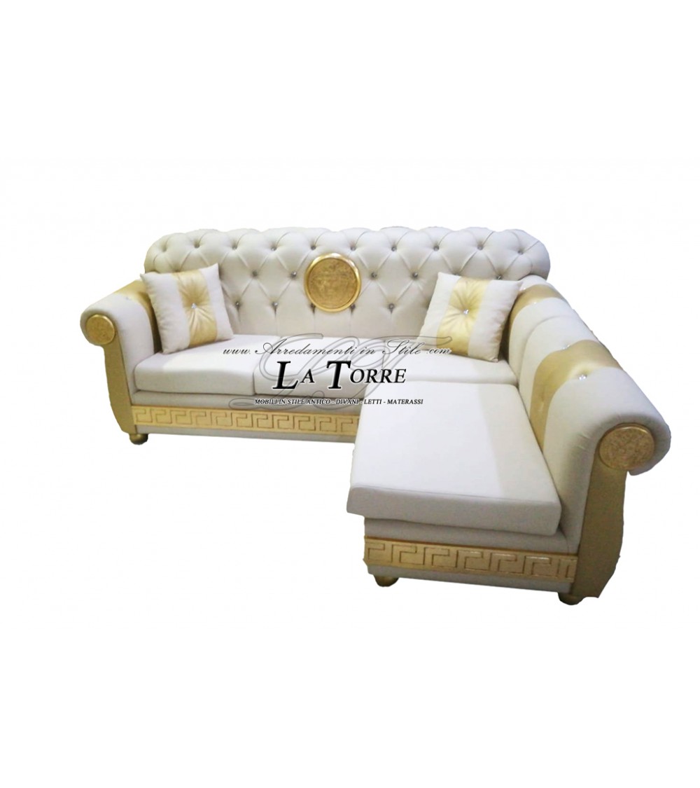 3 seater sofa peninsula backrest net and mattress Chesterfield modern Medusa Goddess eco-leather ivory and gold swarovski AZ06