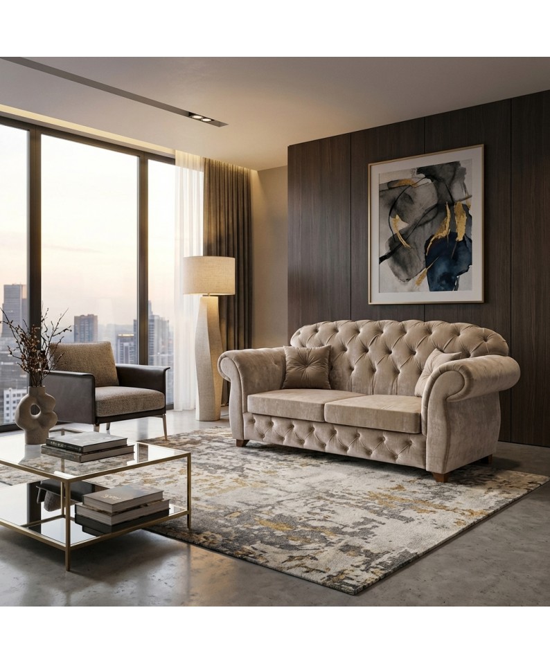 Its compact and well-proportioned structure makes it perfect for even the smallest spaces, without sacrificing the comfort and striking presence typical of the Chesterfield style. The rounded armrests and attention to detail further enhance the sofa's exclusive character.