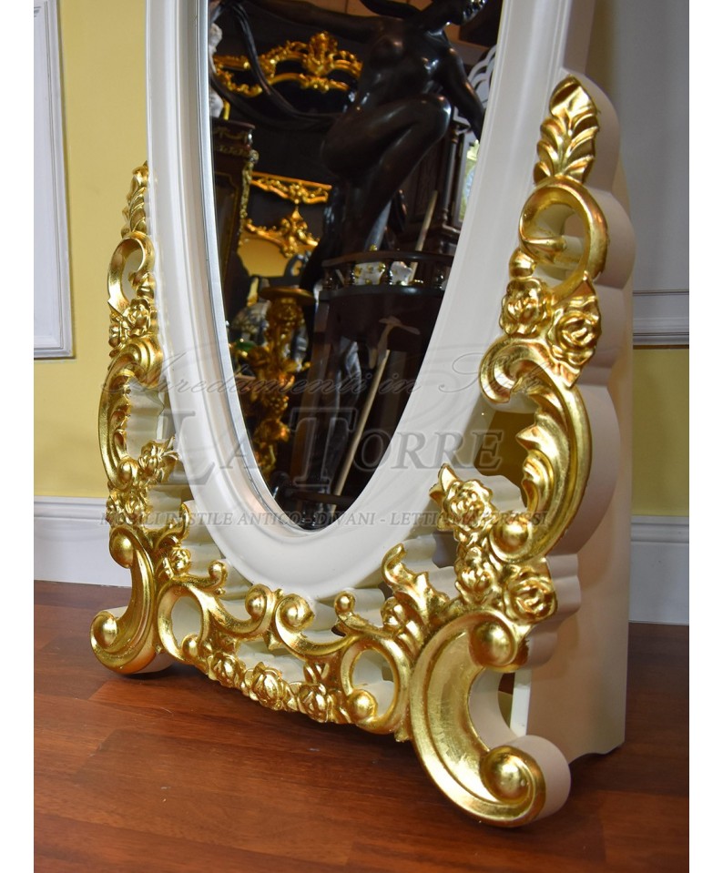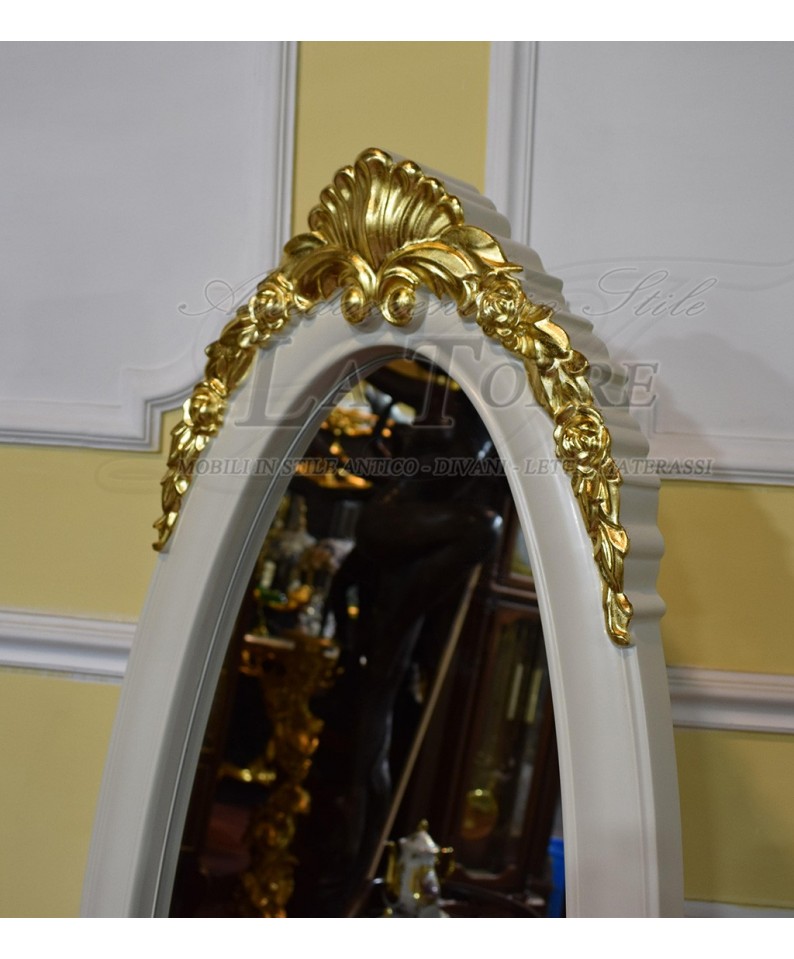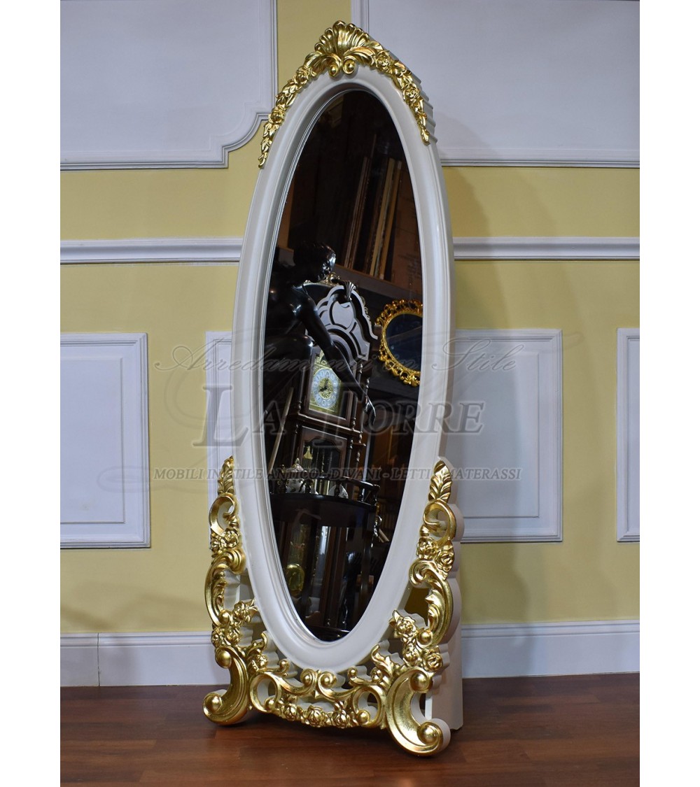 Elisabette baroque style floor standing mirror in ivory and gold in carved wood