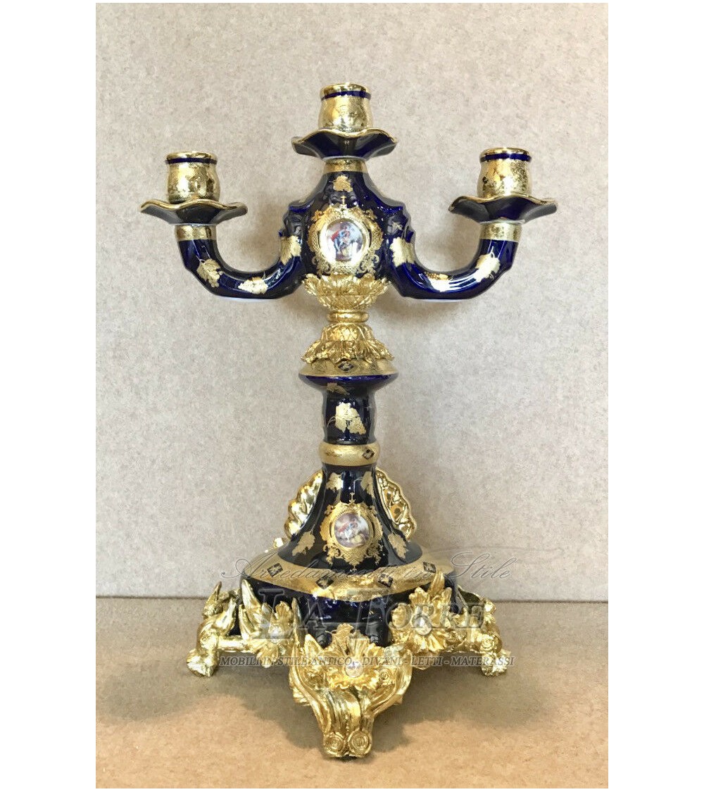 Blue and gold porcelain painted Liberty style three-flame candlestick candelabra P36
