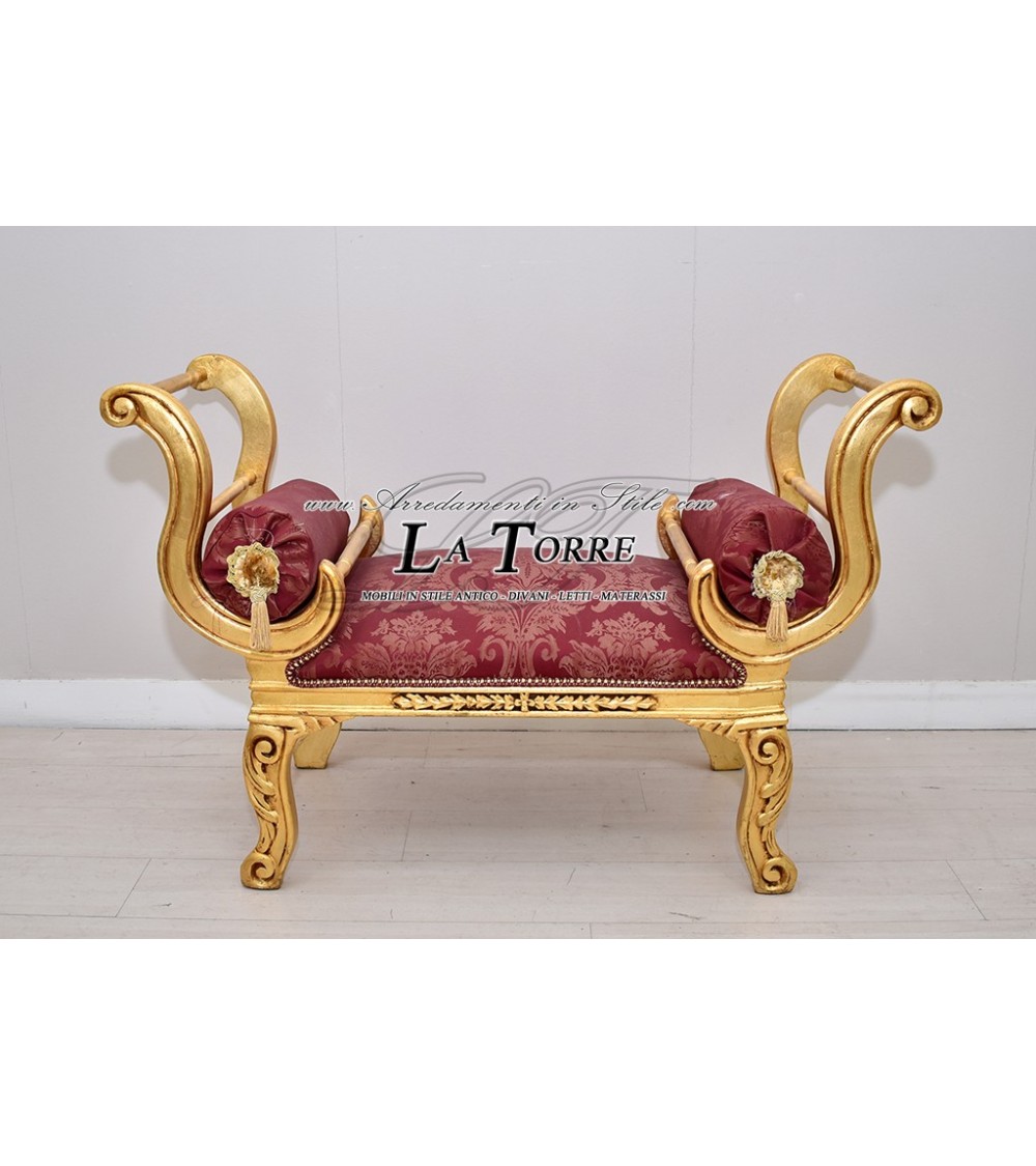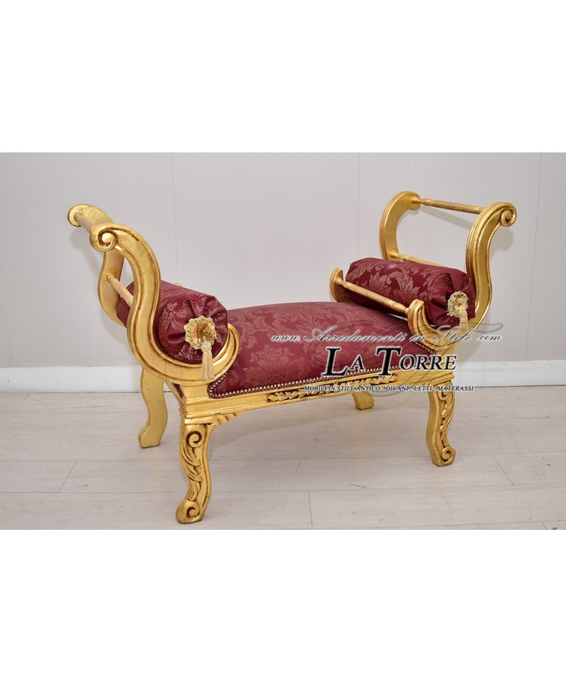 Dormeuse Pompeian bench sofa bench gold wood burgundy damask fabric AL1891