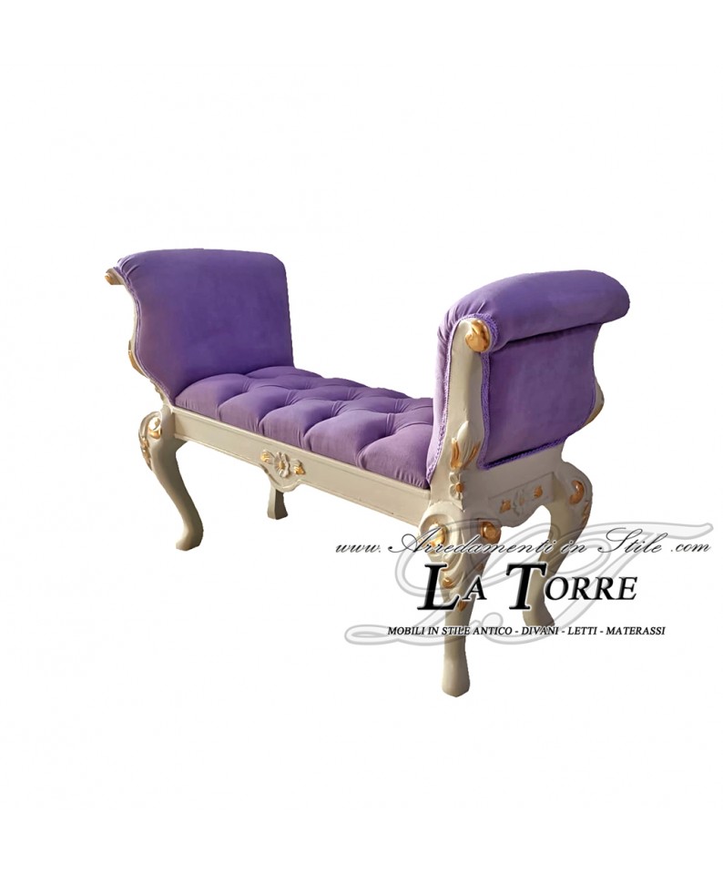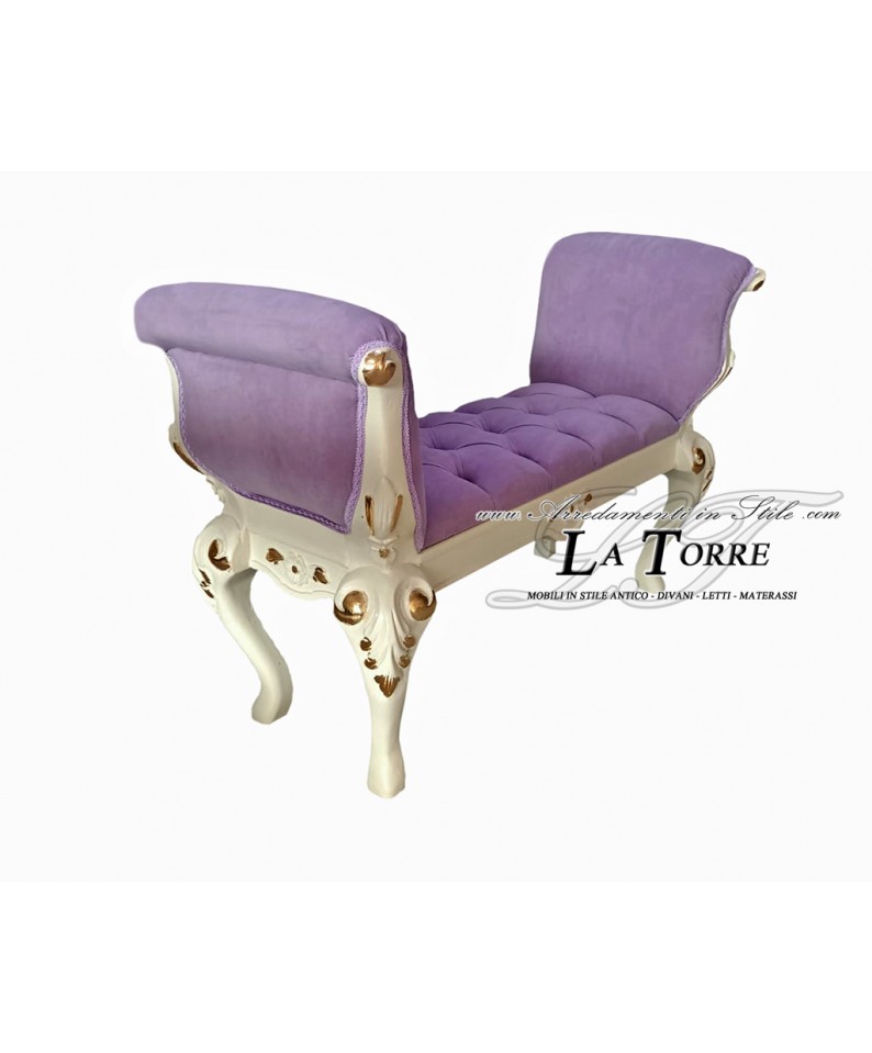 This splendid classic Baroque-style bench is a masterpiece of elegant craftsmanship. Crafted from solid wood with an ivory finish and gold leaf details, it features a tufted seat upholstered in soft lilac/purple fabric for a refined and sophisticated touch.