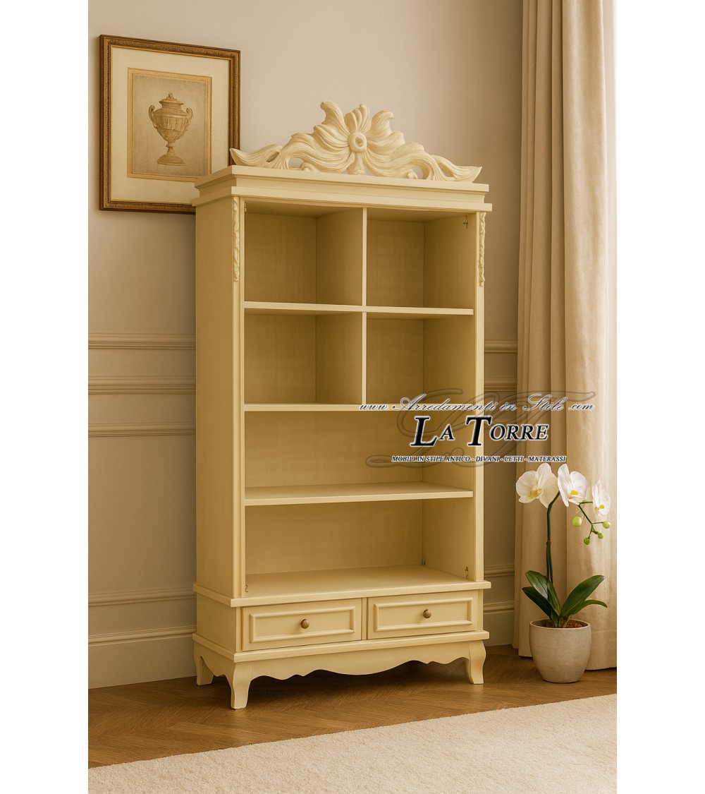 The AZN05 Baroque Bookcase embodies the timeless elegance of classic furniture. Crafted from solid wood with an ivory finish , it is embellished with carved details and a finely decorated frame that gives the piece a regal allure. The two lower drawers and central shelves offer ample space for books, decorative objects, and precious collections, making it perfect for living rooms, studies, or prestigious entryways .