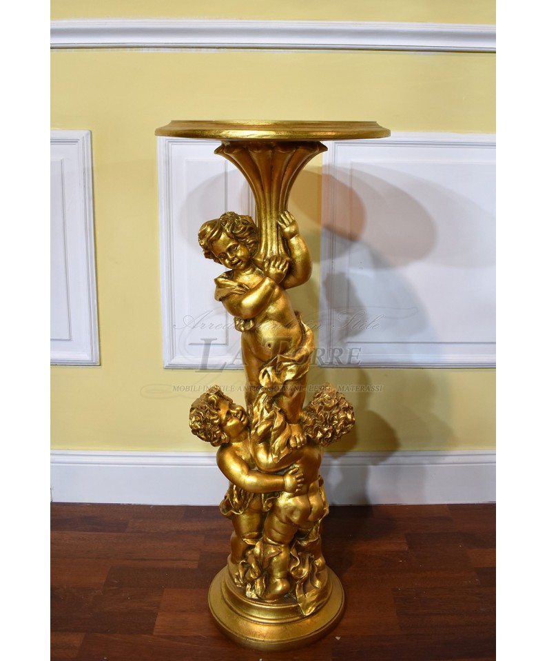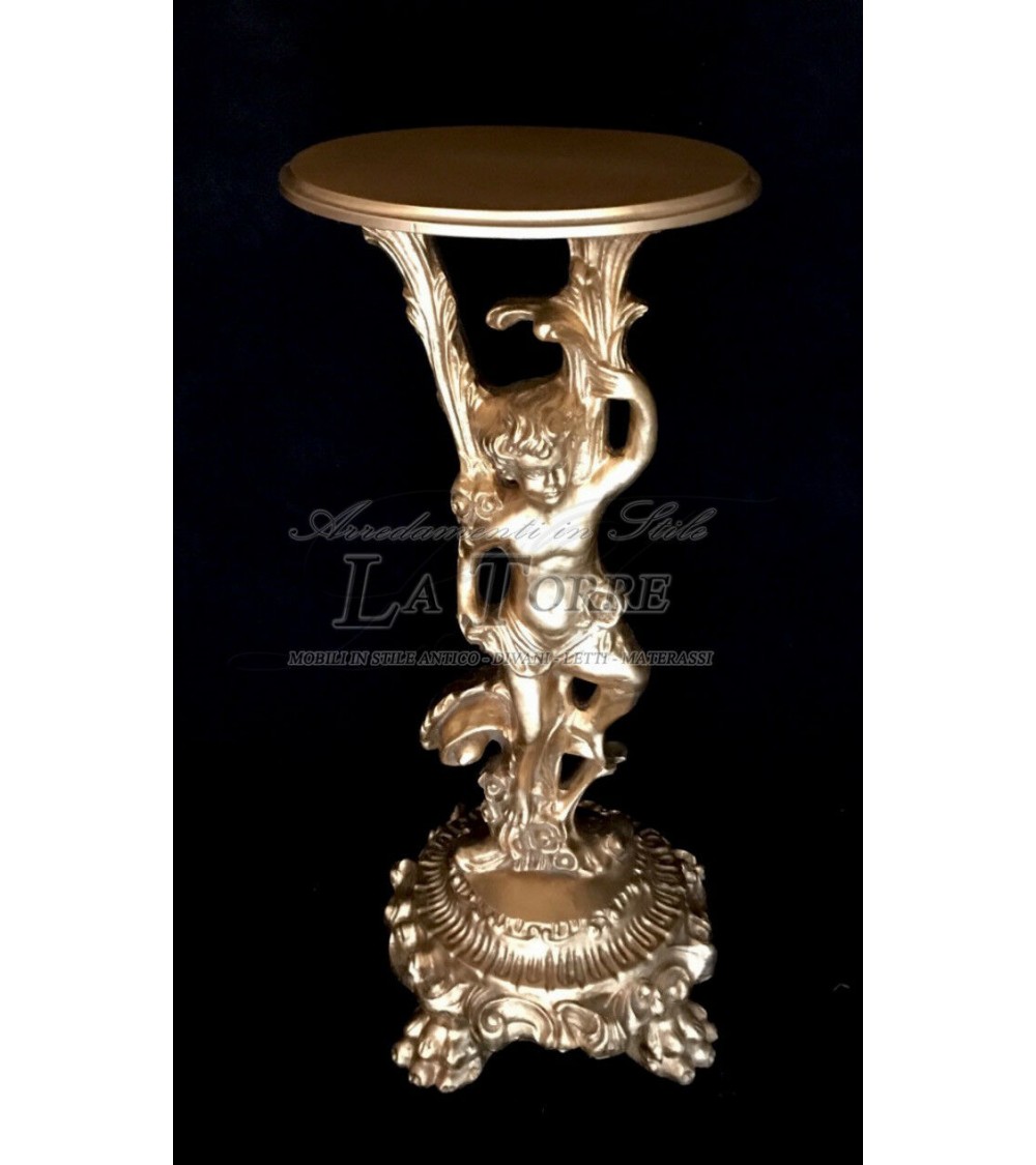 Telephone stand column silik antique riser Angel putto gold baroque, presents a harmonious and refined design. A graceful cherubic figure, entirely finished in a uniform and luminous gold tone, acts as the main support element. The cherub is depicted in a dynamic pose, with arms extending upwards to support the circular top.
