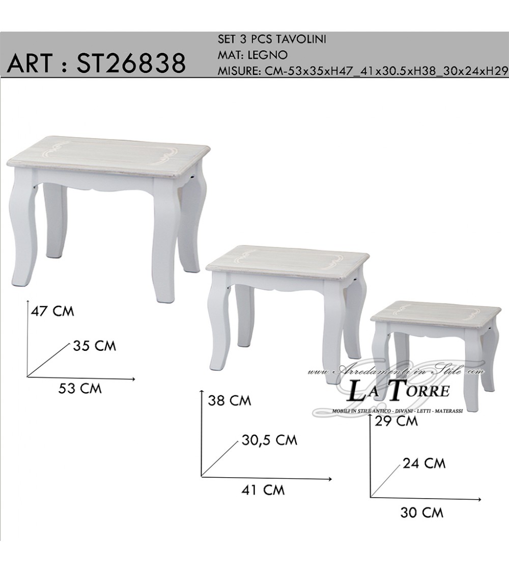 This elegant set of three wooden coffee tables, each of different sizes, is designed to add both functionality and sophistication to your living room or dining area. The bright white finish, combined with a classic design with curved legs, makes them a versatile piece of furniture that can easily be combined with a variety of interior styles, from traditional to shabby chic. Ideal for serving drinks and snacks, displaying books or magazines, or simply as a base for decorative items such as vases and candles, these coffee tables provide practical and accessible storage surfaces. They can be grouped together to create a dynamic focal point or used individually in different areas of the room, depending on your needs. Crafted from sturdy wood, these tables offer durability and stability, making them a practical as well as stylish choice for your home.