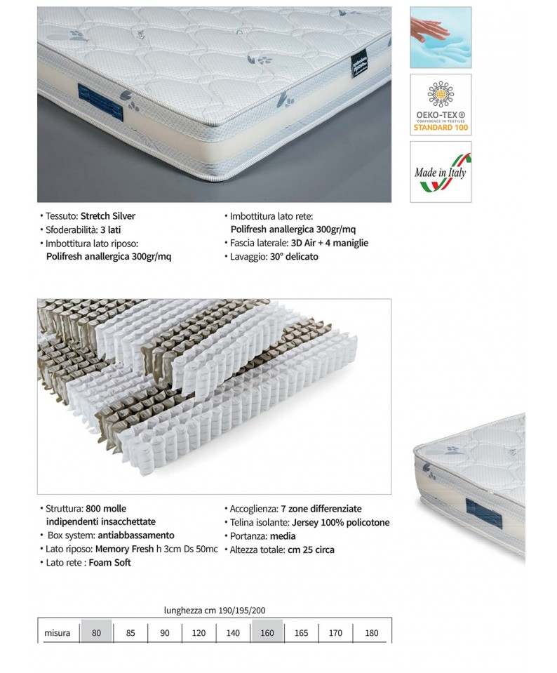 The "Relax Spring" mattress is built using a type of covered and independent spring whose characteristic is that each one works individually according to the pressure received, therefore it is ergonomic, perfectly accommodating the various areas of the body having 7 zones of differentiated bearing capacity. Further comfortable thanks to the layer of memory fresh, the latest generation thermosensitive material that is particularly breathable and fresh. The fabric has a Silver treatment with antistatic and antimicrobial silver ions.