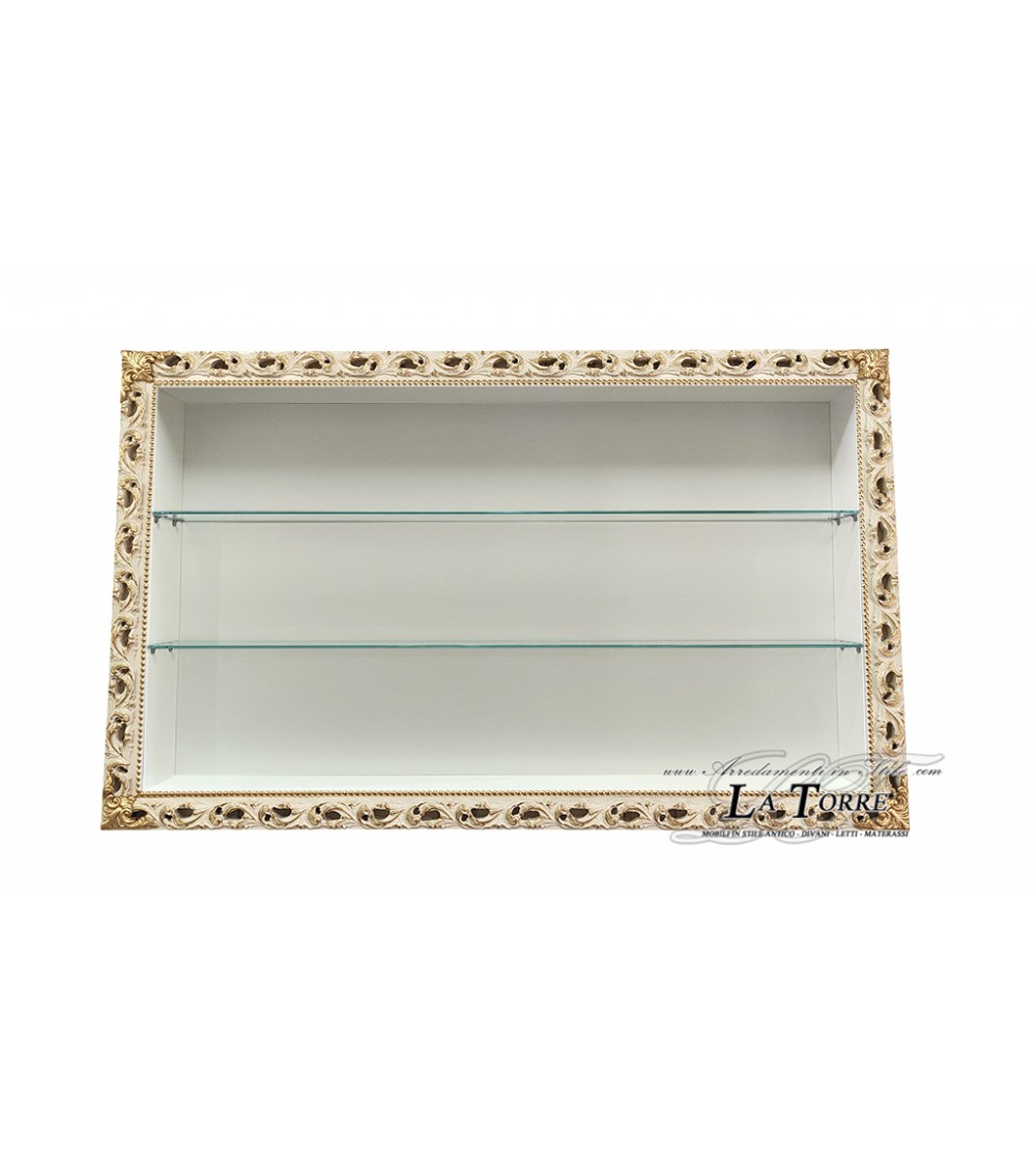 The frame is finely perforated and features elaborate decorations in ivory wood and gold, typical of the Baroque style. The interior of the display case is white and features two thin glass shelves, creating three display spaces. The display case appears to be designed to be fixed to the wall and could be used to display decorative objects, collections or as a custom-made TV stand. The overall appearance is elegant and refined, in line with the aesthetics of classic Italian furniture.
