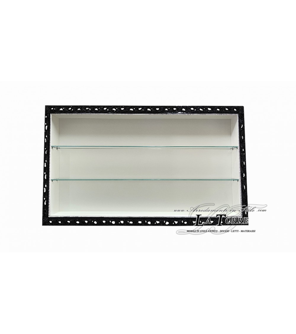 The frame is finely perforated and features elaborate decorations in black wood, typical of the Baroque style. The interior of the display cabinet is white and features two thin glass shelves, creating three display spaces. The display cabinet appears to be designed to be fixed to the wall and could be used to display decorative objects, collections or as a custom-made TV stand. The overall appearance is elegant and refined, in line with the aesthetics of classic Italian furniture.