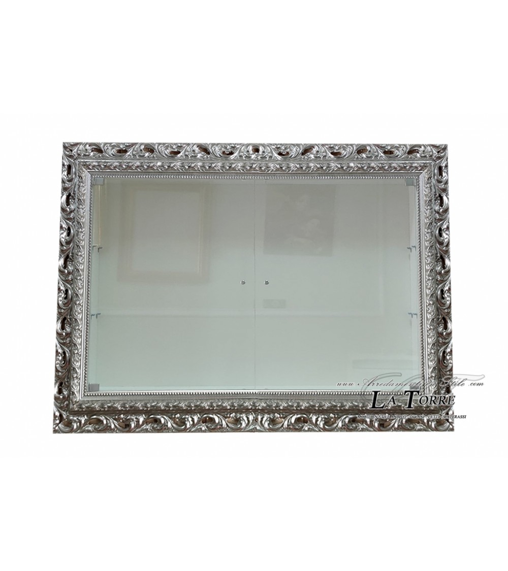 Baroque style wall hanging display cabinet perforated frame custom made tv stand box. This is an elegant baroque style wall display cabinet, featuring a rich silver frame. The frame is finely crafted with perforated and sinuous patterns, typical of the baroque aesthetic, which give it a luxurious and decorative look.