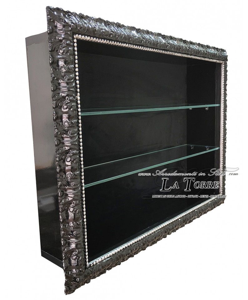 VTMadrid Baroque Style Wall Hanging Classic Display Cabinet Custom TV Stand Frame Box, crafted with a deep black gloss finish, this display cabinet stands out for its richly carved frame, which features ornamental motifs and silver details that give it a touch of sparkling refinement. Inside, two clear glass shelves offer the ideal space to display your most precious objects, from crystal to porcelain, from art books to collectible ornaments. The black background creates a dramatic contrast that highlights each piece on display, its customizable dimensions make it a focal point capable of defining the style of an entire room, while the quality of the materials and attention to detail guarantee its durability and timeless charm.