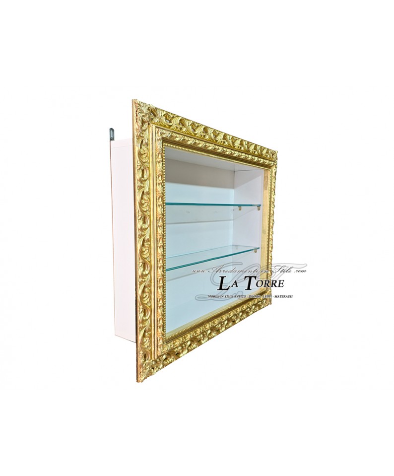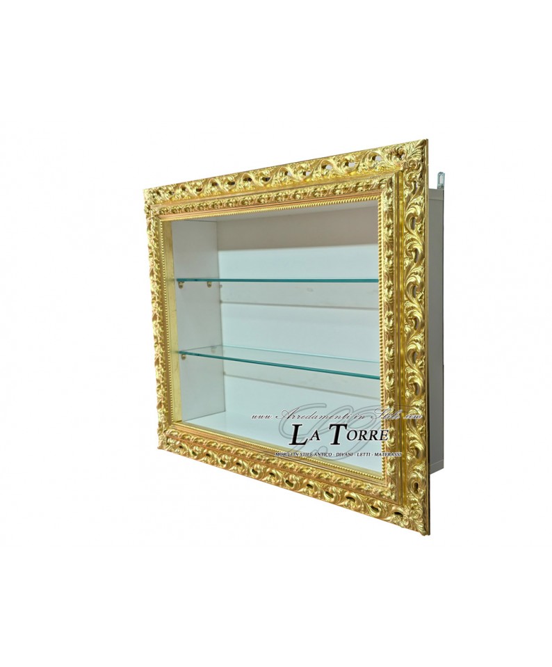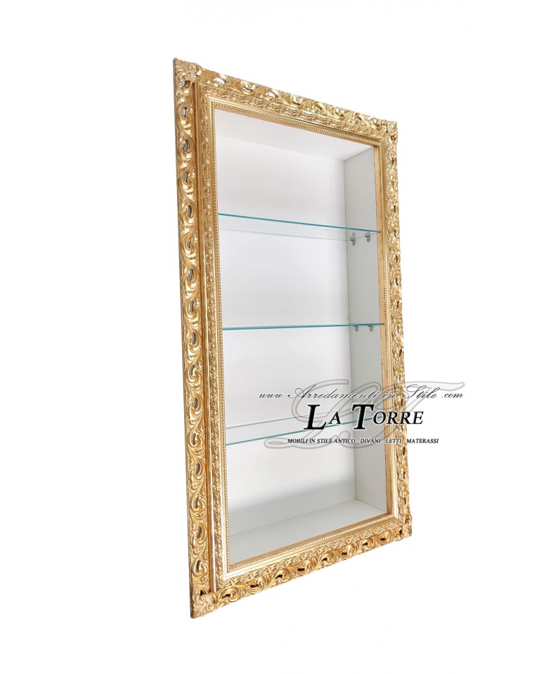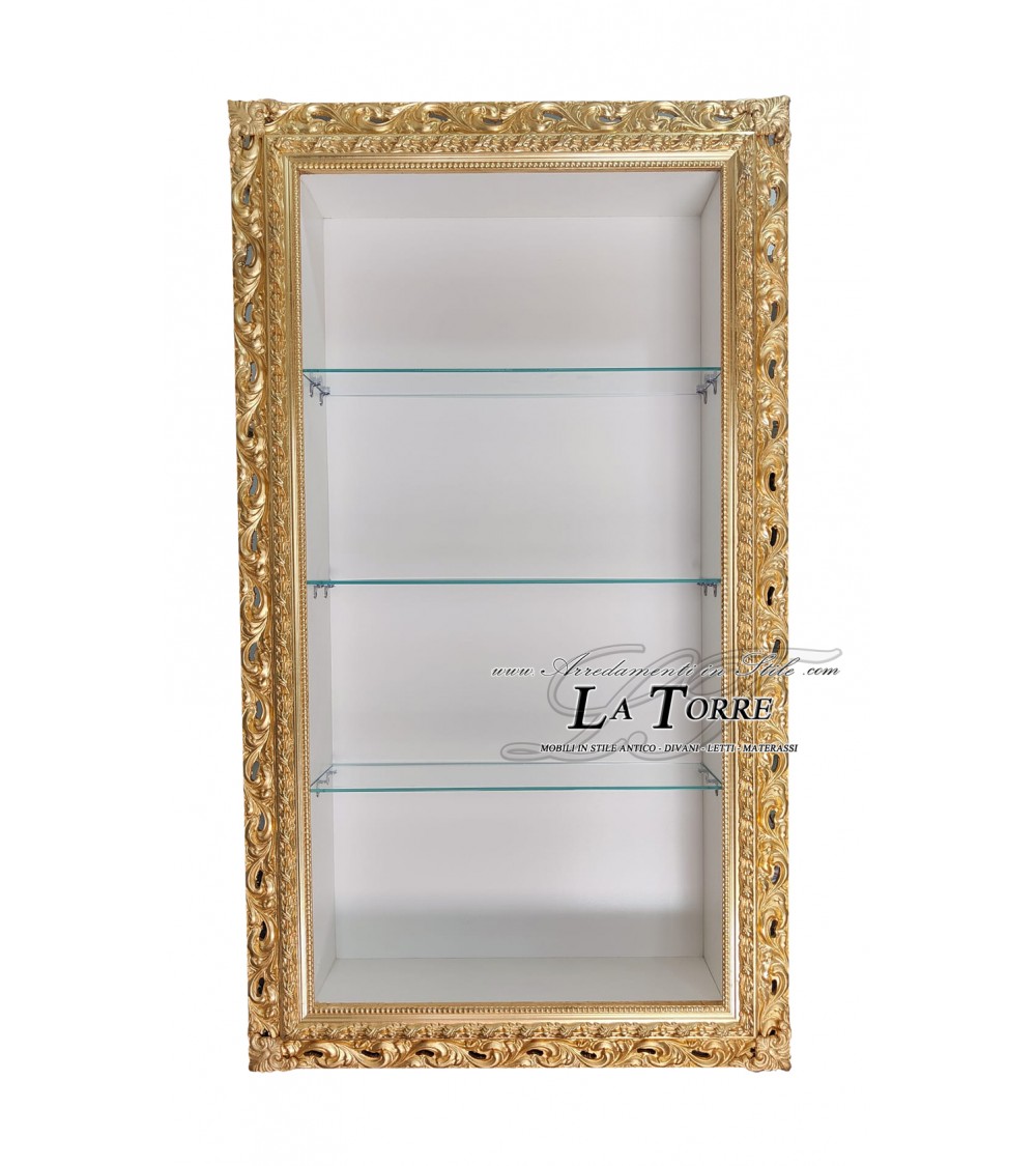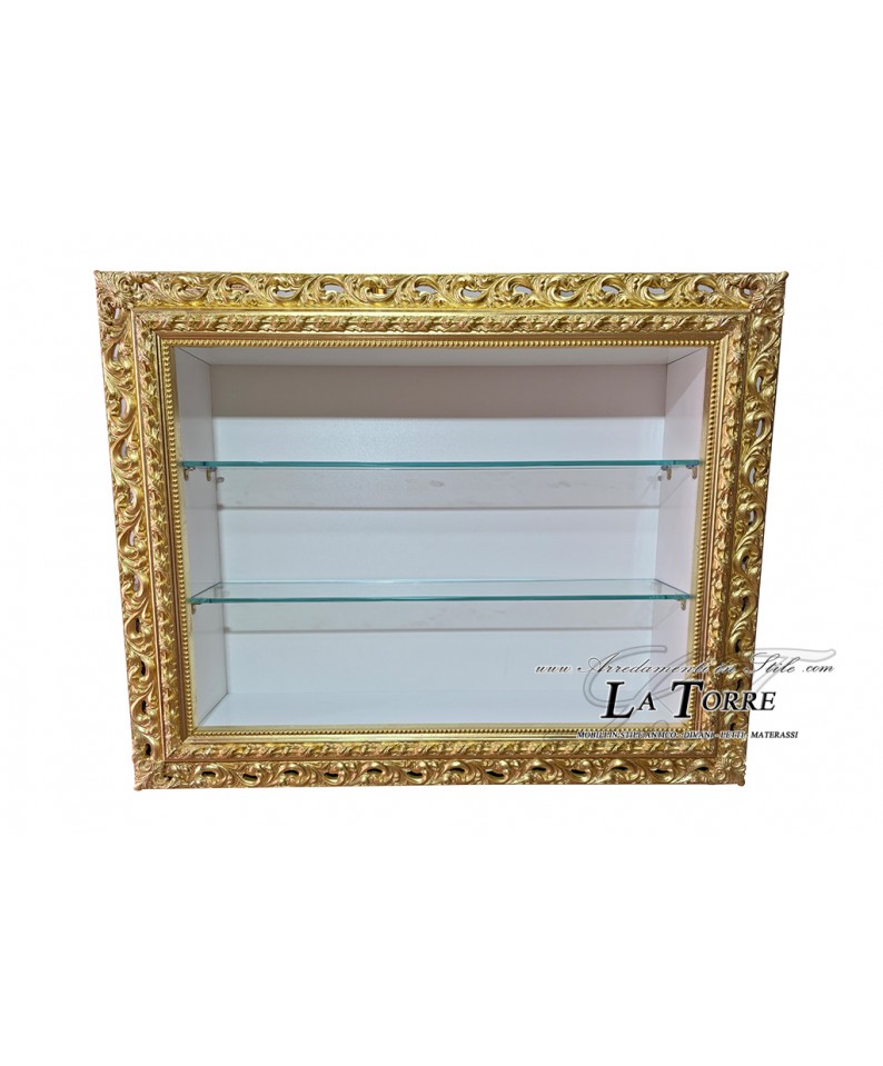 A splendid Baroque-style wall-mounted display cabinet , a true gem of craftsmanship that combines the opulence of classical tradition with modern functionality. This refined display cabinet is embellished with a finely carved and perforated frame , crafted with meticulous craftsmanship, transforming a simple furnishing accessory into a truly decorative work of art.