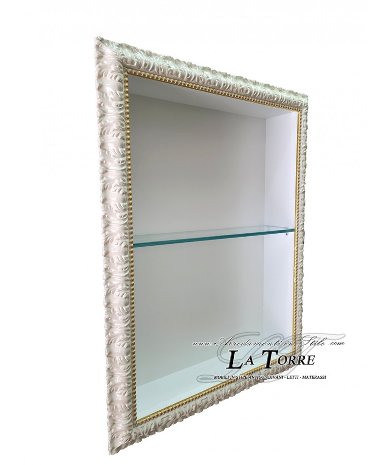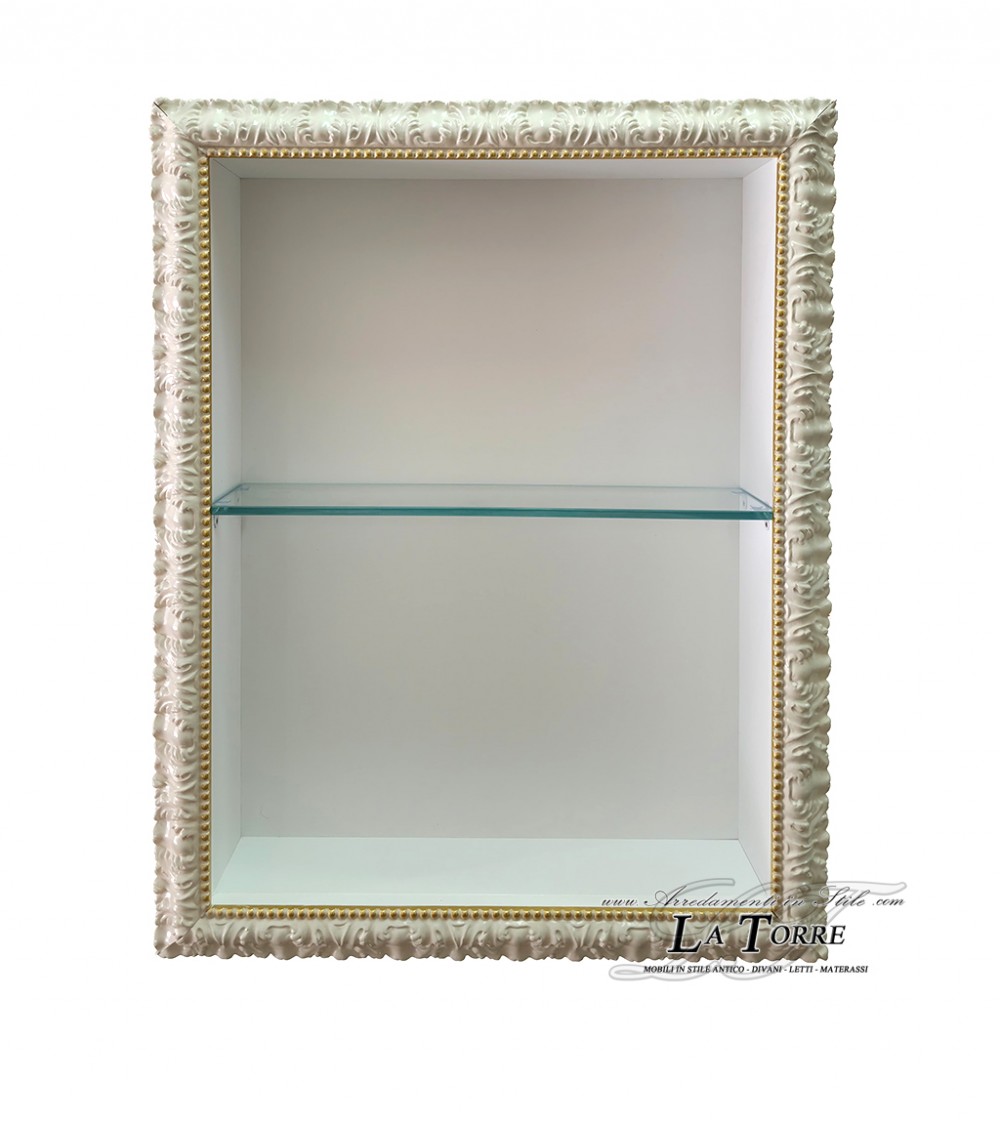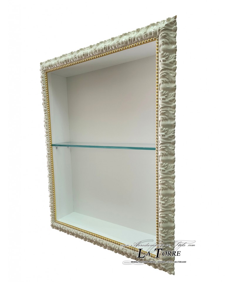 Classic Baroque-style wall-mounted display case in ivory, richly detailed with sinuous and ornamental details. A thin gold border runs along the inner edge of the frame, adding a touch of luxury and defining the display case's interior. The interior is white and features thin, transparent shelves, offering three levels of display. These shelves are ideal for elegantly displaying decorative objects, collections, or other valuable items, protected from dust. The front is open. The overall design is designed to add a touch of classic elegance and a functional display element to any space.