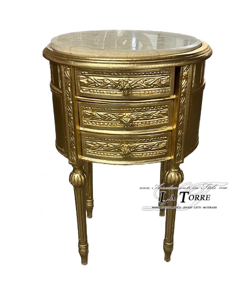 Antique Louis XV style bedside table, oval coffee table with telephone holder drawers, Baroque gold marble LT3054
