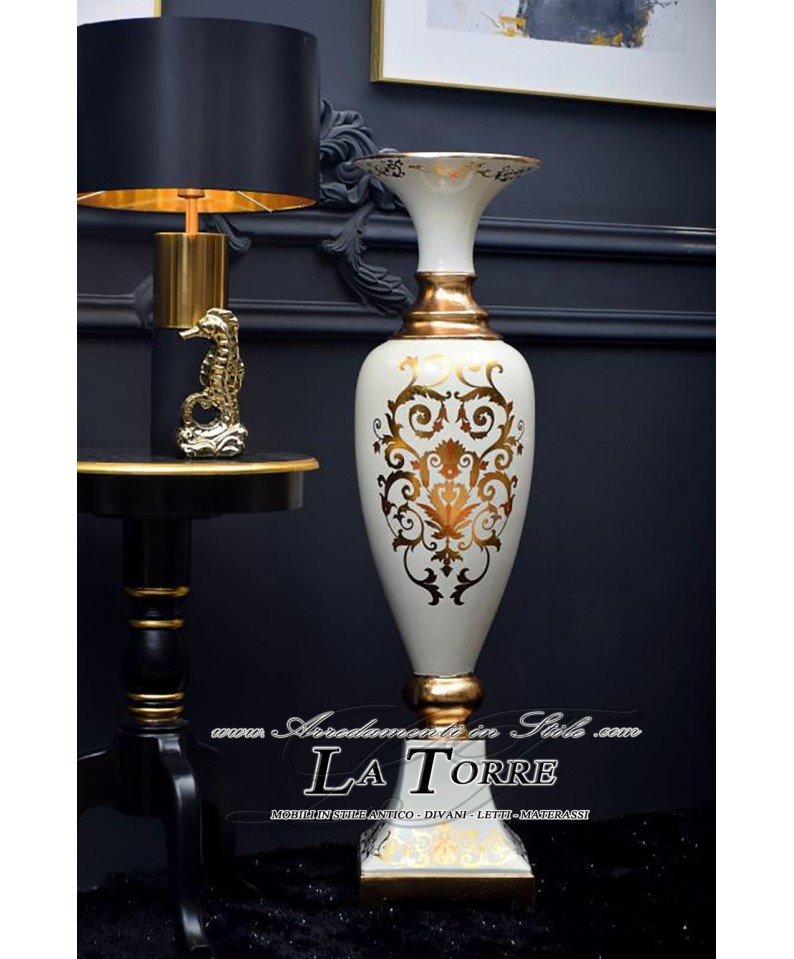Ceramic hand-painted amphora cup decorative ceramic, with a refined and elegant design. It stands out for its slender ivory-colored body, enriched by a sumptuous gold decoration with volute motifs, which evokes a classic and opulent style. The upper part of the vase has a flared neck with a golden upper edge, embellished with additional gold ornaments. The base consists of a worked pedestal, which combines ivory and golden sections, giving stability and elegance.