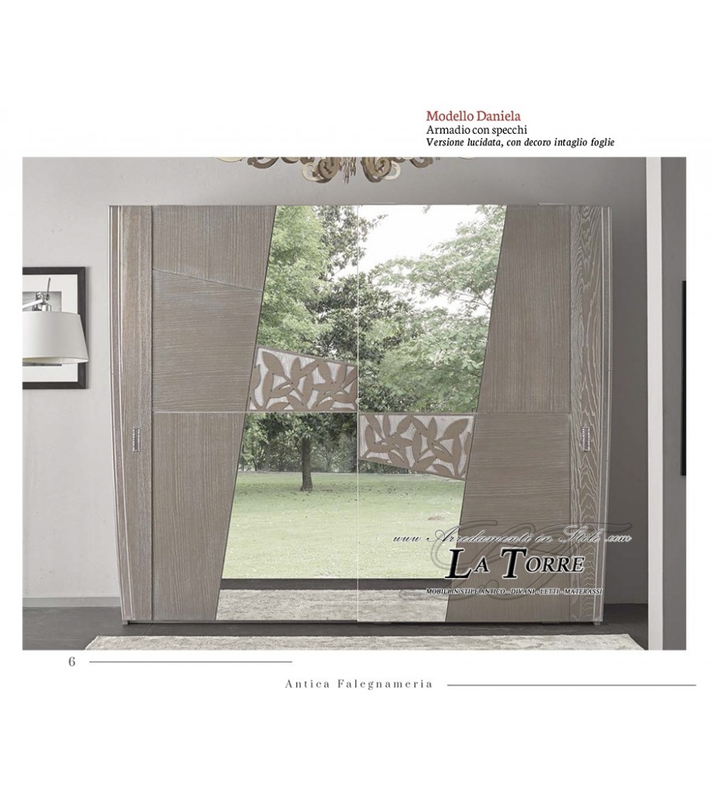 Daniela wardrobe 2 sliding doors modern classic polished wood inlay leaves mirror chest of drawers