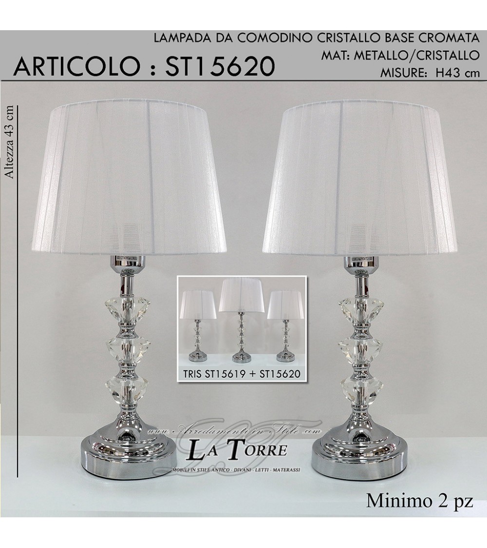 Questa coppia di abatjour modello ST15620 è un pezzo d'arredo elegante, caratterizzato da una struttura in metallo cromato e dettagli in cristallo, che le conferiscono un aspetto raffinato e brillante, con un'altezza complessiva di 43 cm, si distingue per il suo paralume bianco che diffonde una luce morbida e accogliente, ed è ideale per aggiungere un tocco di classe a qualsiasi ambiente, specialmente in coppia, dato che è venduta con un minimo di due pezzi, ed è disponibile anche come parte di un set da tre, come indicato dal riferimento TRIS ST15619 + ST15620.