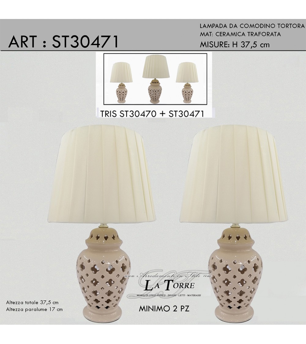 Questa elegante coppia di lampade da comodino, sono un complemento d'arredo perfetto per aggiungere un tocco di luce calda e design raffinato a qualsiasi ambiente, come la camera da letto o un angolo lettura. La base della lampada è realizzata in ceramica traforata di colore tortora, caratterizzata da intagli decorativi che creano affascinanti giochi di luce quando la lampada è accesa, aggiungendo un elemento visivo intrigante. Il paralume plissettato, di colore chiaro, diffonde una luce morbida e accogliente, ideale per creare un'atmosfera rilassante.