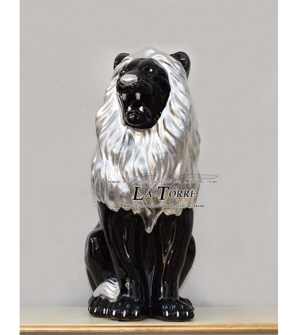 Animali in ceramica statua scultura Leone bocca aperta nero criniera foglia argento swarovski h70cm PR13