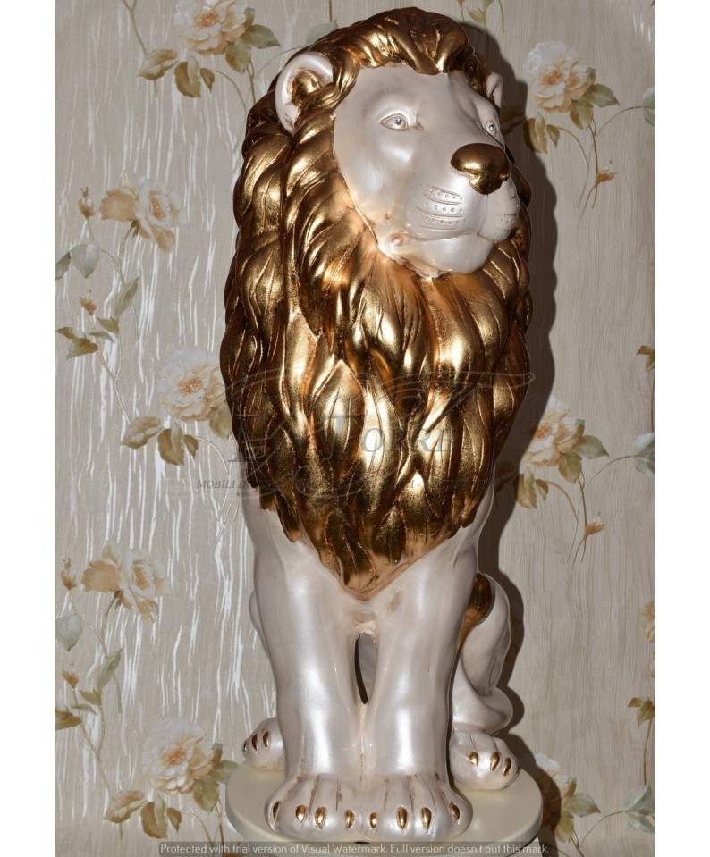 Statua ceramica scultura Leone bocca chiusa bianco perlato criniera Foglia oro con swarovski H90cm PR23