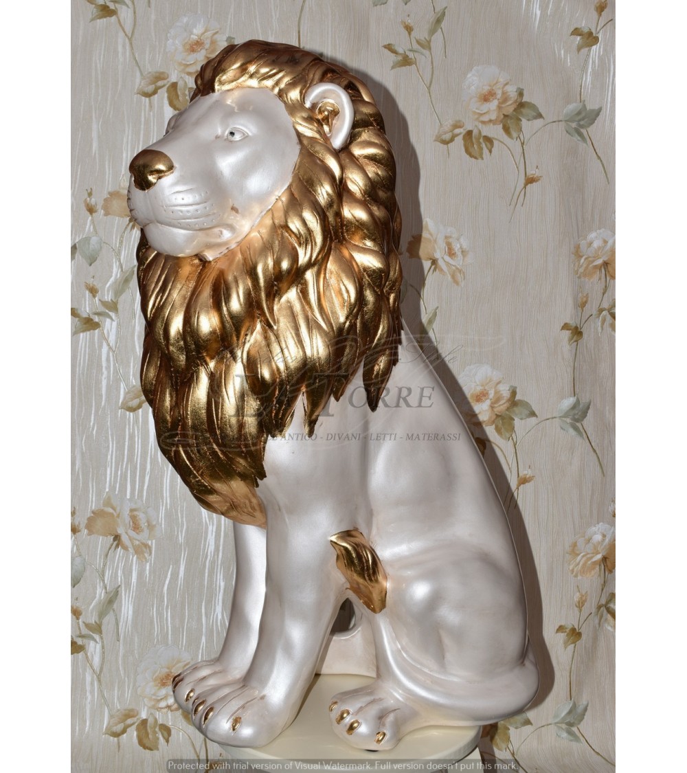 Leone bocca chiusa in posizione seduta, realizzata con una finitura lucida e perlata. Il corpo del leone è di un brillante colore bianco perlato iridescente, mentre la criniera, la punta della coda e i dettagli sulle zampe sono rifiniti in foglia oro . La posa maestosa e la combinazione di colori creano un pezzo d'arredo elegante e sontuoso.