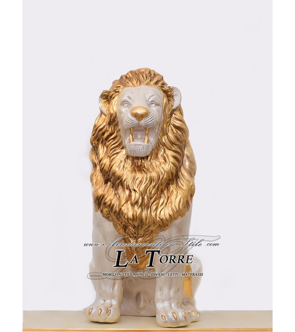 Animali in ceramica statua scultura Leone bocca aperta bianco perlato criniera oro swarovski H90cm PR14