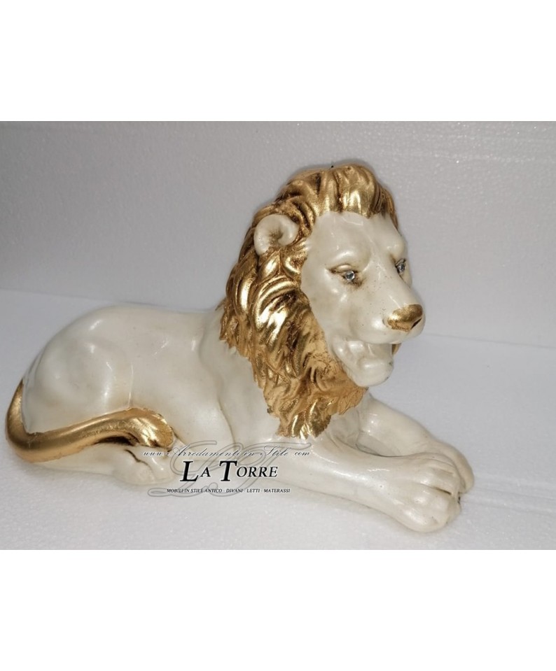 Leone sdraiato bianco perlato foglia oro sdraiato con la testa leggermente sollevata in ceramica. Il corpo del leone è realizzato in una tonalità avorio, con una finitura liscia e lucida. La folta criniera del leone è il punto focale della scultura, caratterizzata da una ricca colorazione dorata con una texture che ne accentua il volume e il dettaglio, conferendole un aspetto lussuoso e imponente. Anche le zampe e alcuni dettagli del muso presentano finiture dorate, che aggiungono un ulteriore tocco di opulenza. Gli occhi del leone sembrano essere incastonati con piccole pietre brillanti o strass, che catturano la luce e conferiscono un'espressione viva e attenta. La bocca è leggermente aperta, come se fosse in procinto di respirare profondamente o emettere un lieve ruggito.