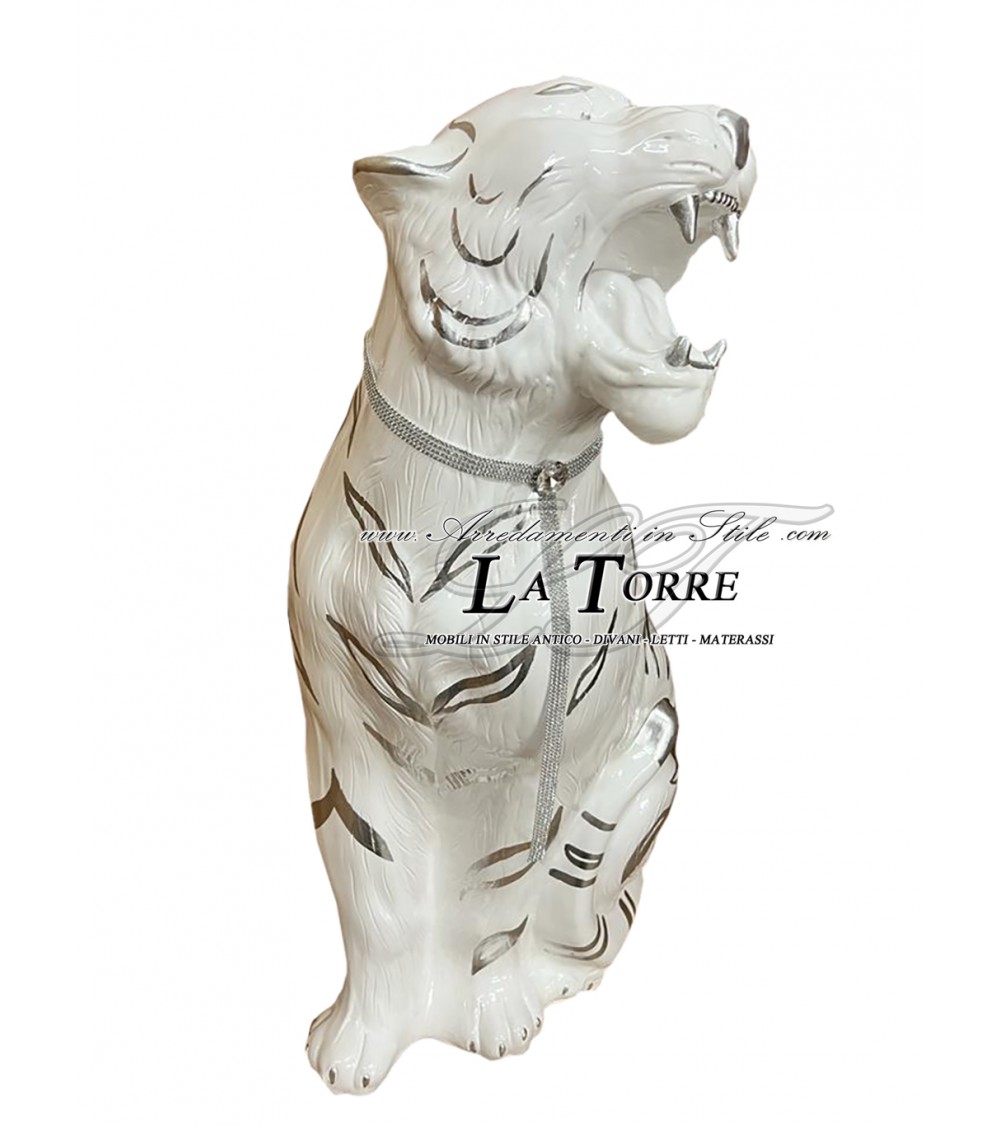 Tigre bocca aperta in ceramica, realizzata in ceramica bianca lucida e finiture argento. La figura della tigre è rappresentata in una posa dinamica, quasi in procinto di ruggire, con la bocca aperta e i denti ben visibili, esprimendo forza e selvaggia maestosità. Le striature tipiche del manto della tigre sono stilizzate e realizzate in una finitura argento brillante, creando un netto contrasto con il bianco candido del corpo e conferendo un tocco moderno ed elegante all'opera. Al collo, la tigre indossa un vistoso collare di strass luminosi, con un pendente centrale che aggiunge un ulteriore elemento di lusso e brillantezza.